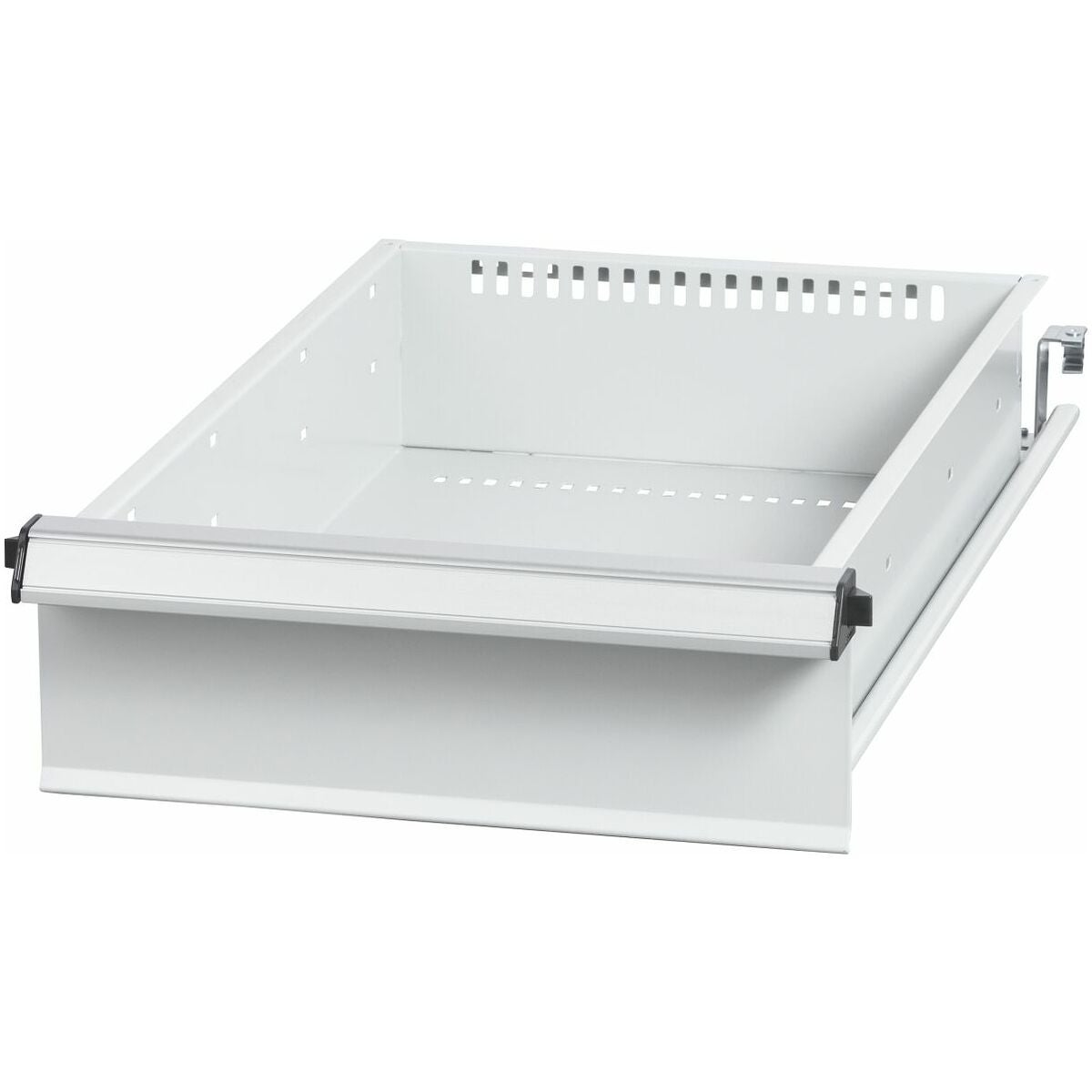 Helt utdragbara lådor av stabil stålkonstruktion med differentialutförande och 75 kg bärförmåga. Aluminiumgrepplister. Utdragslådor med stansade hål för fastsättning av slitsade skiljelister i 25 mm raster (vid lådfronthöjd 75 mm och större).