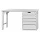 Arbetsbänk av stabil stålkonstruktion. Ben 50 mm breda med tvärstagning och fäste för höjdjustering i 25 mm raster. Fötter med plastglidstöd, skonar golvet. Med 1 par knutplåtar för förstyvning. Lådhurts centralt låsbar med stiftcylinderlås.