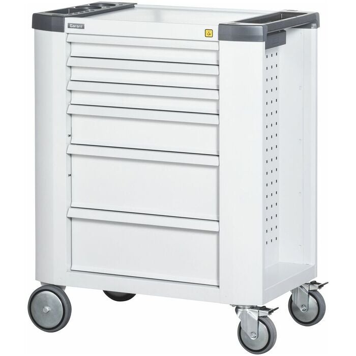 Verkstadsvagn ESD-ledande, enligt DIN EN 61340-5-1. Hylla av pulverbelagd ledande stålplåt och extra ledande hylla med smådelsfack och burkhållare av polyamid, reptålig och skonsamma mot ytor.