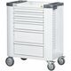 Elektriskt ledande hjul med vardera 2 kullagrade fasta och svängbara hjul med omönstrad löpyta, minimalt rullmotstånd, tyst gång och trådskydd. Svängbara hjul med spärr för hjul och vridkrans. En enkelutdragssäkring gör det omöjligt att öppna flera lådor samtidigt.