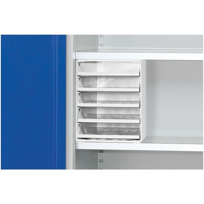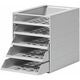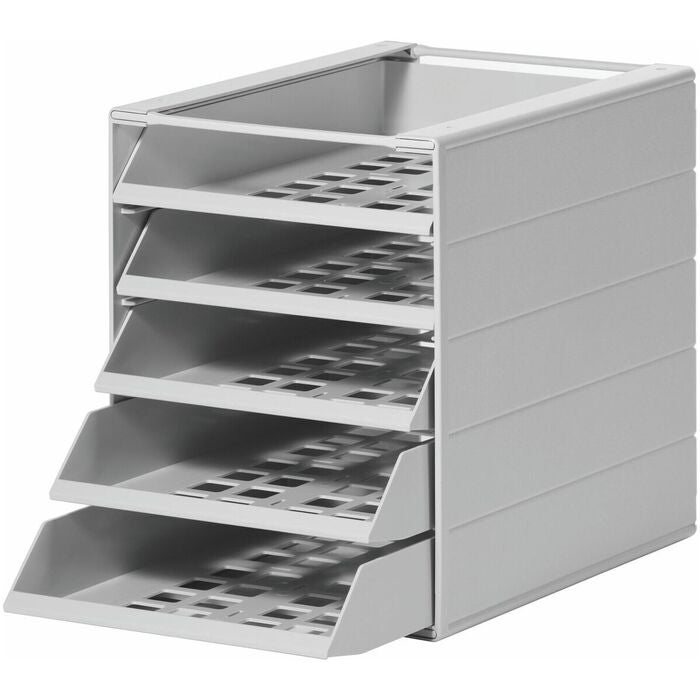 Lådbox av slagtålig styrenplast i format C4. 5 öppna lådor. Plast i grå färg.