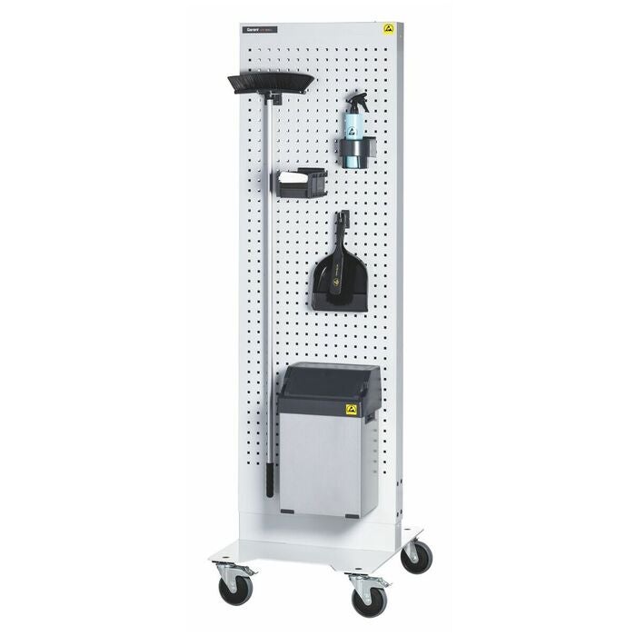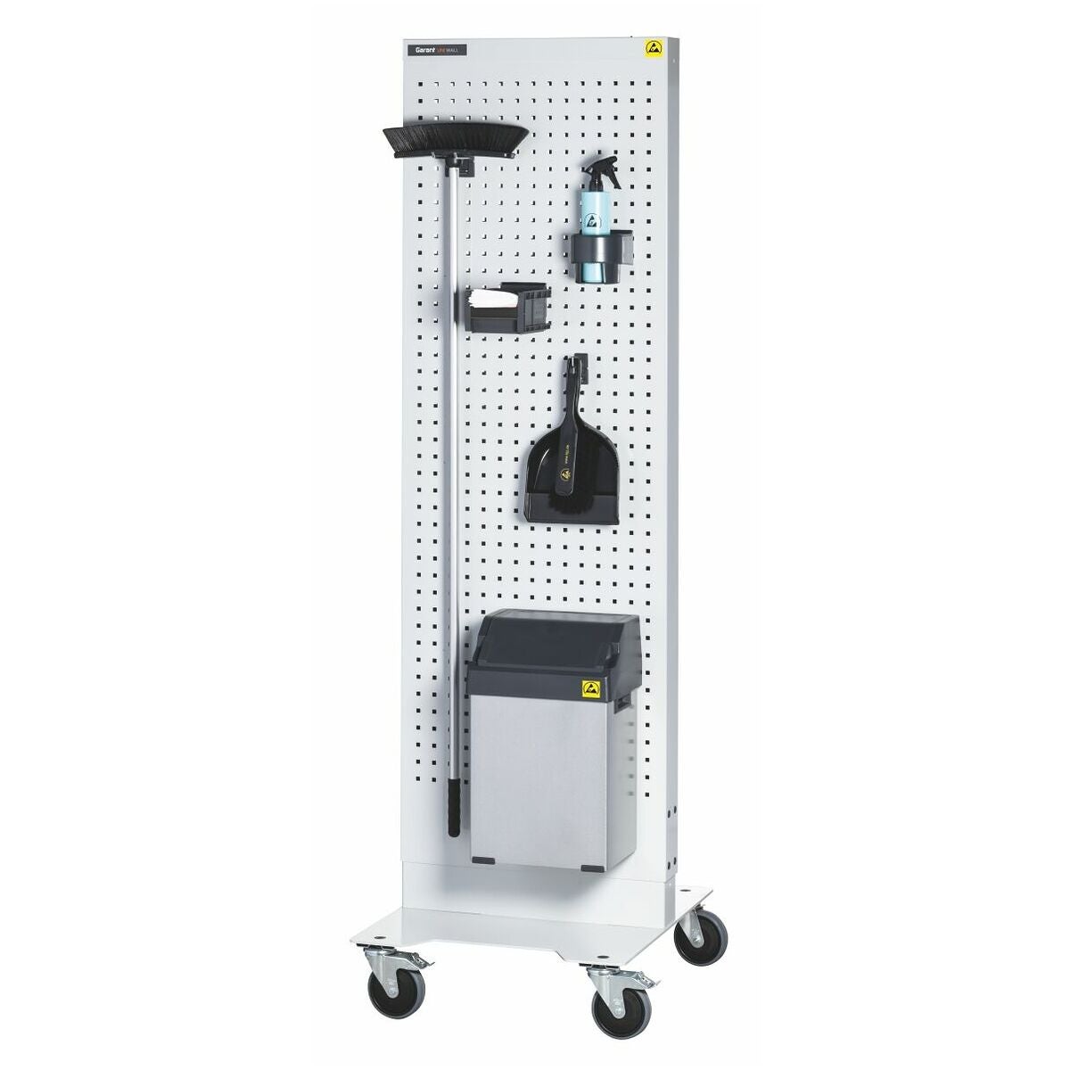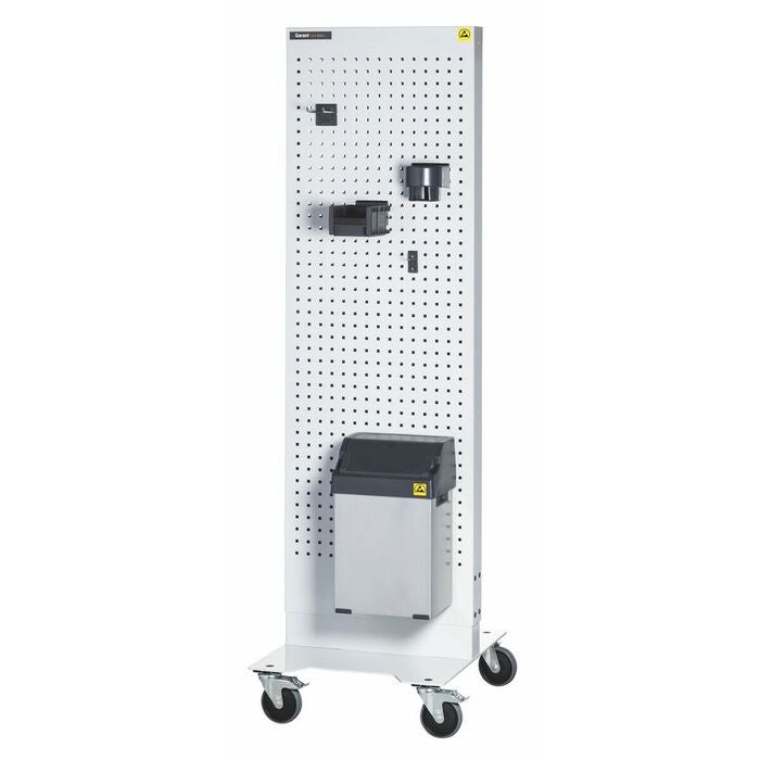 Åkbar GARANT Uni Line ESD Wall; ESD easyBin-materialuppsamlare nr 972910 storlek 25; ESD-öppen förvaringslåda nr 972321 storlek AB1 med GARANT easyFix lådhållare; GARANT easyFix verktygshållare 90°, 100 mm lång; GARANT easyFix verktygshållare dubbel 45°, 100 mm lång; GARANT easyFix flask-/burkhållare med invändig diameter på 90 mm.
