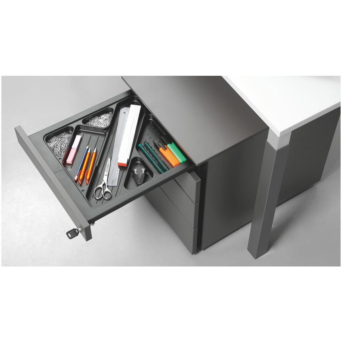 Rullbehållare 600 mm djup av melamin/trä. Metalldraglådor med front av trä och handtag på sidan. Översta draglådan med skrivmaterialfack av plast. Inklusive spärr. Infogade och obromsade hjul för mjuka golv.