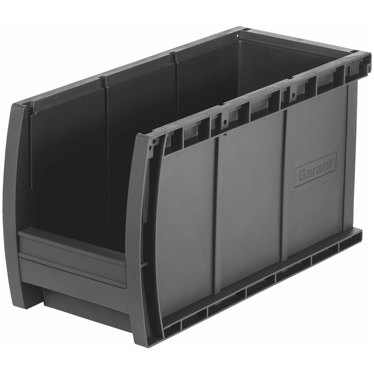 Robust, hållbar öppen förvaringslåda i polypropylen. Tål hög belastning tack vare förstärkt botten och sidoväggar. Ergonomisk hållare på framsidan. Blankpolerad insida för att underlätta plockning och rengöring. Kan märkas med textremsor på framsidan och med kort (i kreditkortsstorlek 85,6 × 54 mm) på baksidan. Öppna förvaringslådor med samma bredd som kan staplas med rutnätspunkter.
