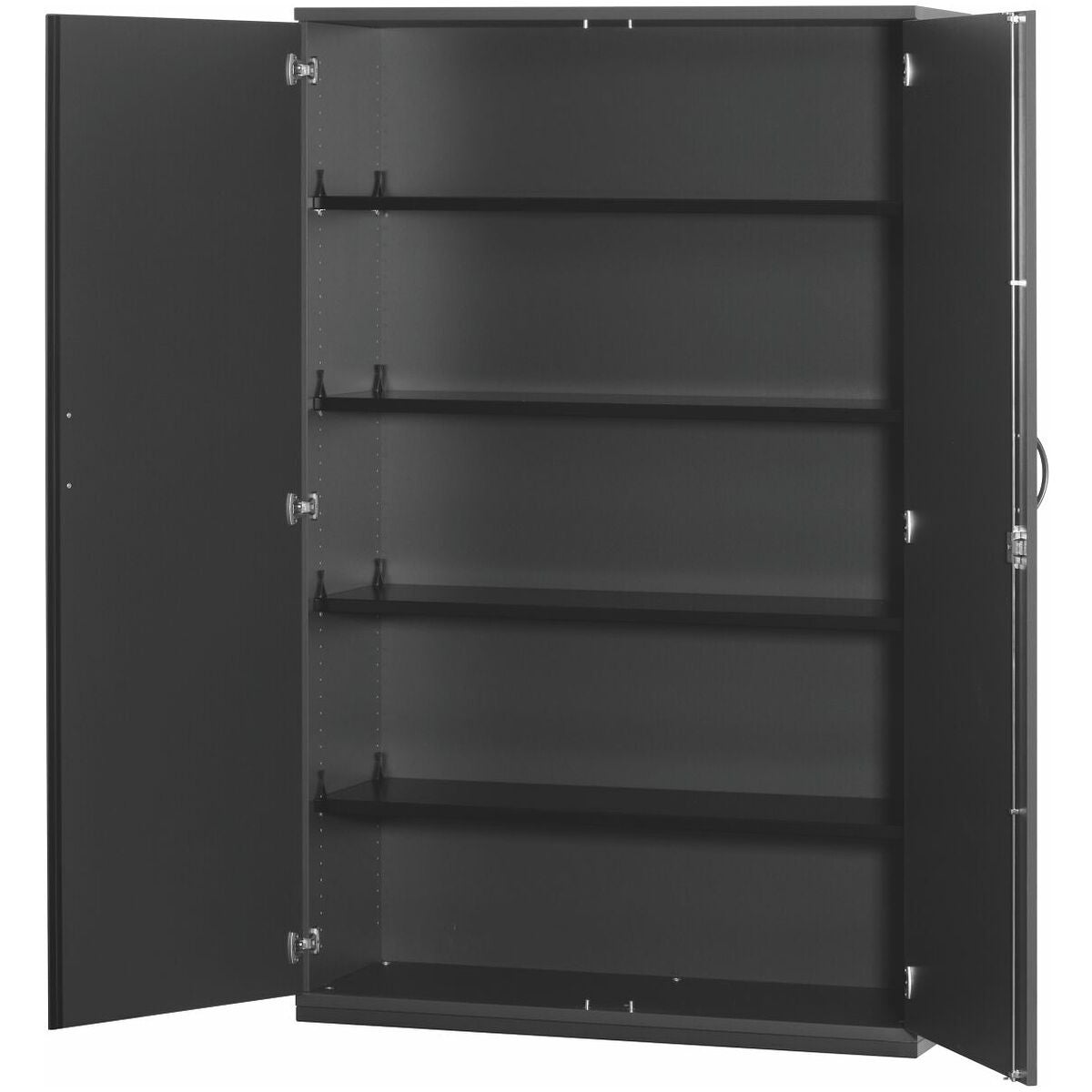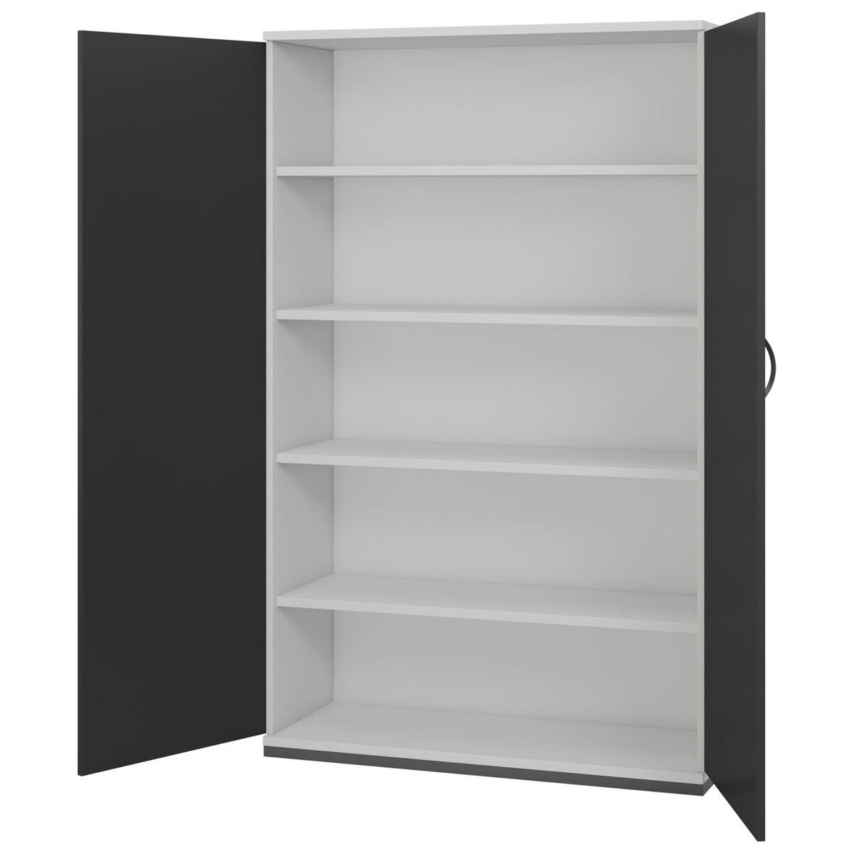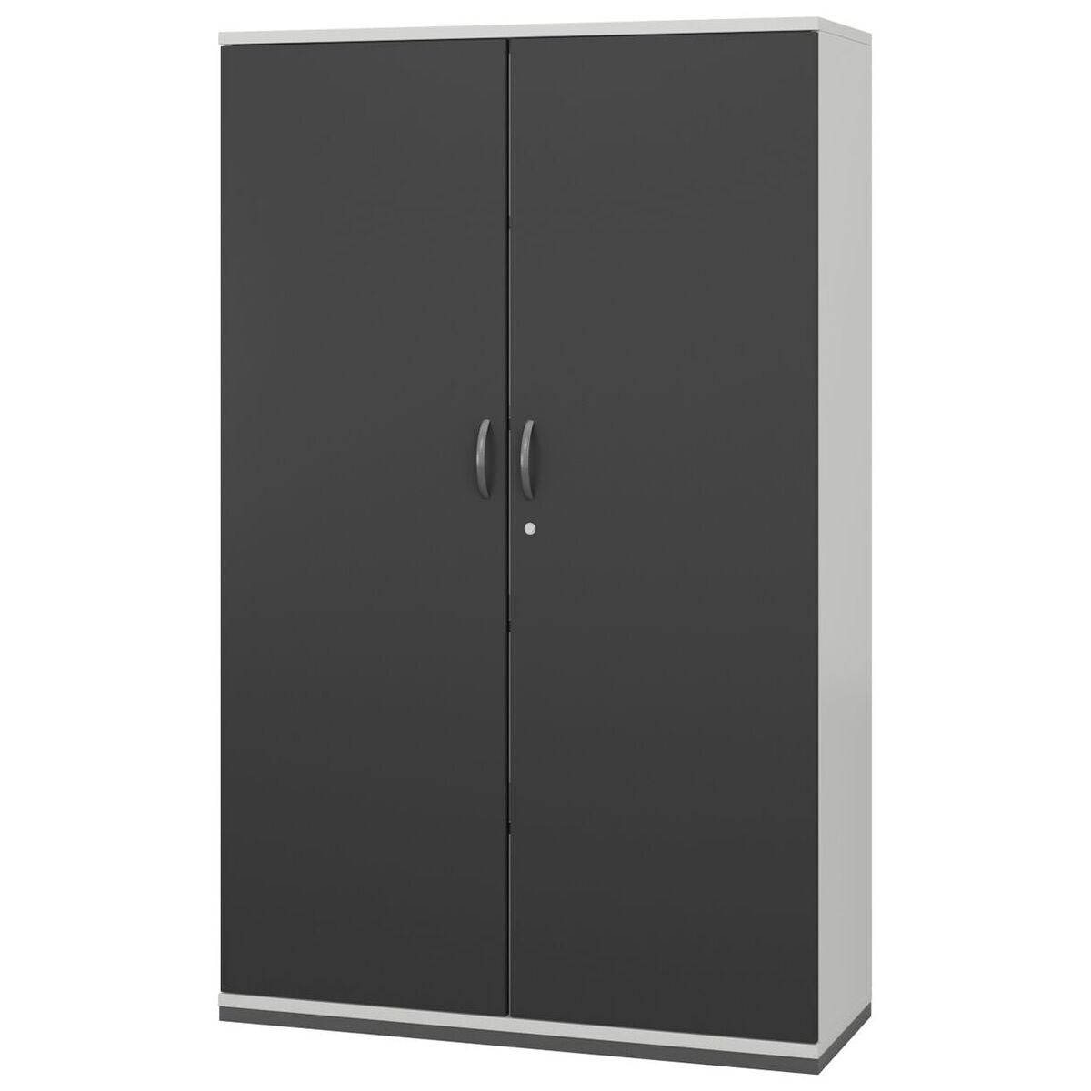 Skåp av trä med gångjärnsupphängd dörr och 4 metallhyllor, tjocklek 25 mm, kan ställas in i intervall om 32 mm, ger fem hyllor med plats för pärmar. Skåp med stabil fönsterförsedd bakvägg. Levereras med båggrepp i metallgrått. Höjd stålsockel 30 mm, alltid metallgrå, inklusive höjdregleringsskruvar. Cylinderlås med två nycklar.
