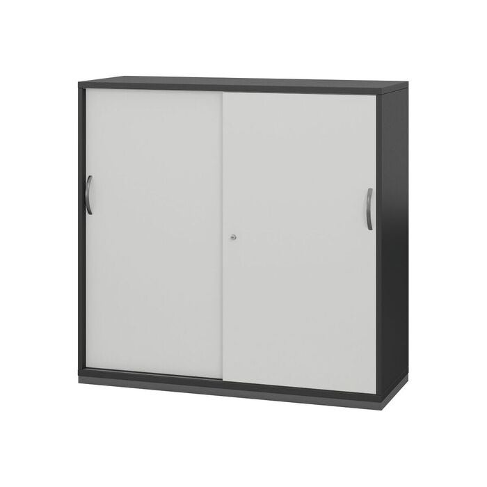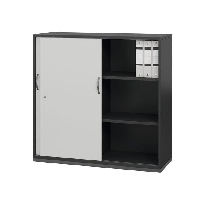 Skjutdörrsskåp av trä med mittvägg och hyllplan (till vänster respektive höger om mittväggen) tjocklek 25 mm, reglerbar i steg om 32 mm. Skåp med stabil fönsterförsedd bakvägg. Levereras med båggrepp i metallgrått. Höjd stålsockel 30 mm, alltid metallgrå, inklusive höjdregleringsskruvar. Cylinderlås med två nycklar.