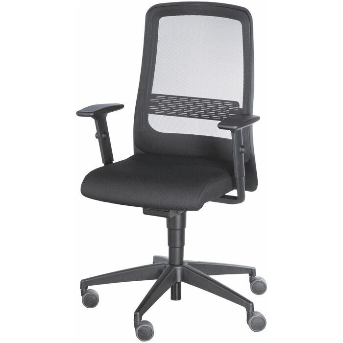Sits med mjuk komfortstoppning med på sidorna insydd botten. Klädsel av 100% polyester. Synkronteknik med automatisk tyngdreglering, kan spärras i främre och bakre sittställning. Med sitsdjup-, sitslutnings- och sitshöjdinställning. Inklusive höjdinställbara armstöd (2D). Universalrullar för mjuka och hårda golv, ⌀ 650 mm fotkors av svart plast.