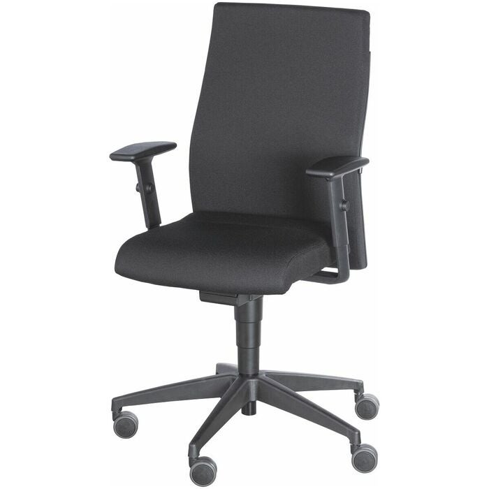 Sits med mjuk komfortstoppning med på sidorna insydd botten. Klädsel av 100% polyester. Synkronteknik med automatisk tyngdreglering, kan spärras i främre och bakre sittställning. Med sitsdjup-, sitslutnings- och sitshöjdinställning. Inklusive höjdinställbara armstöd (2D). Universalrullar för mjuka och hårda golv, ⌀ 650 mm fotkors av svart plast.