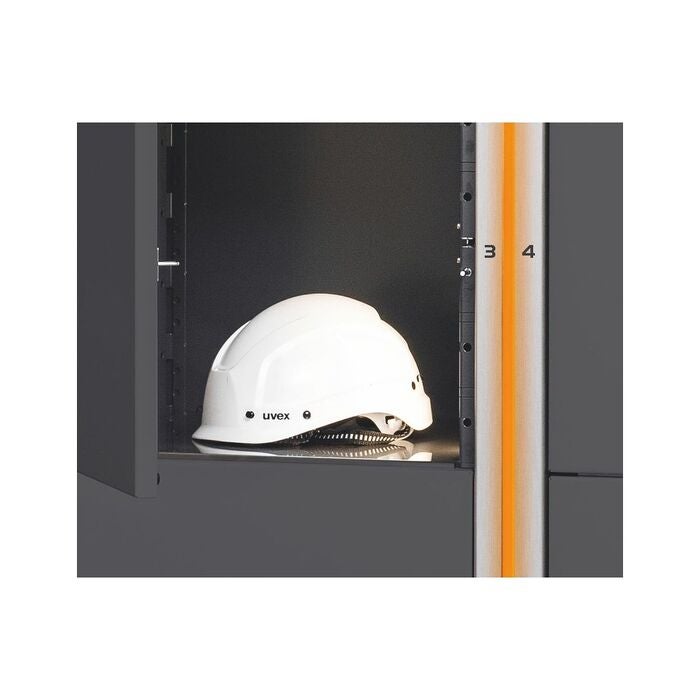 Varuutlämningssystem med fack av olika storlek som garanterad en säker och komplett dokumenterad enkelutlämning. Fackstorlekarna medger förvaring av större artiklar och är förberedda för laddning av batterier. En standardiserad LED-innerbelysning underlättar både identifiering av de automatiskt öppnande facken i mörk omgivning och även själva uttagningen. LED-listen längs facken understöder också uttagnings- och påfyllningsförloppet.