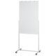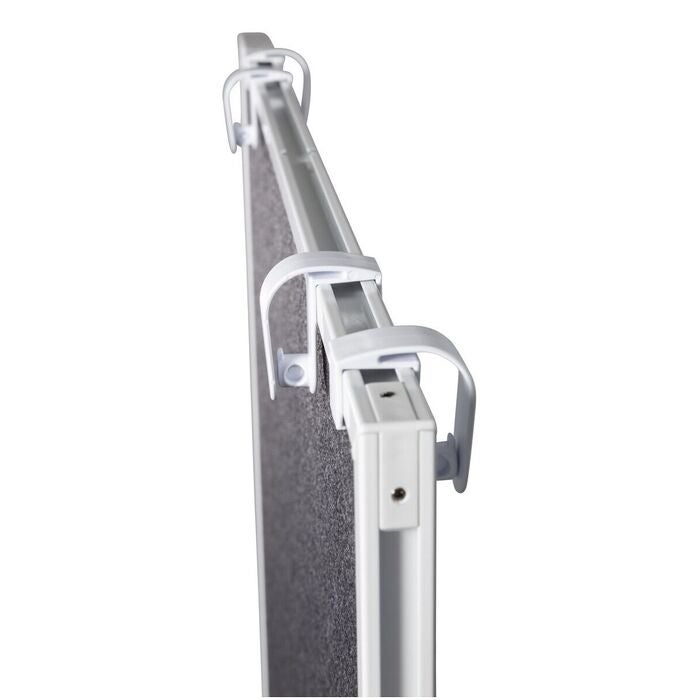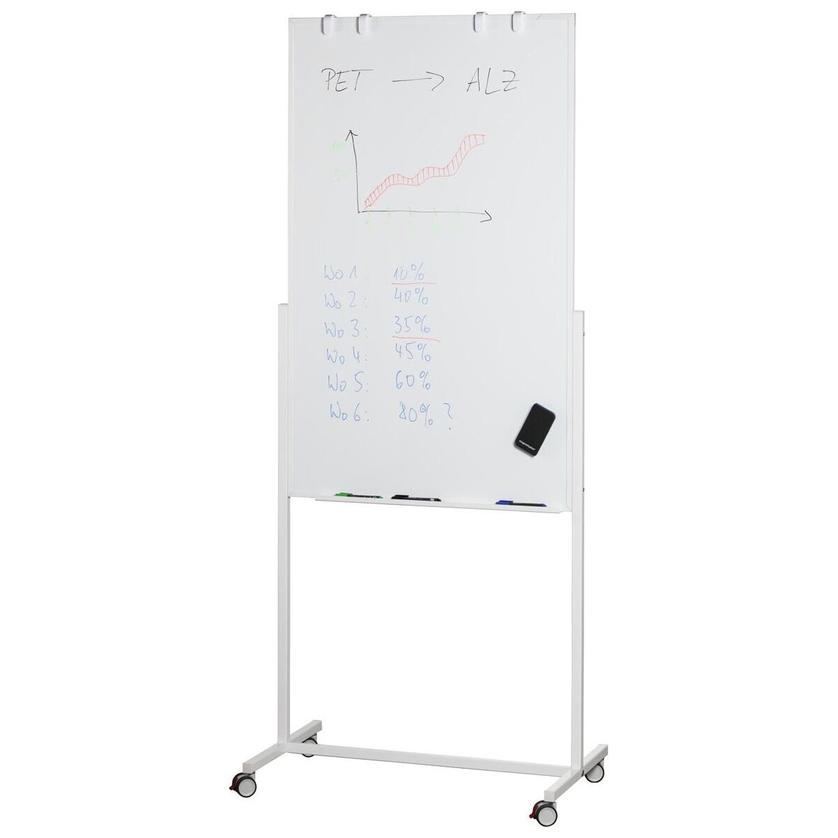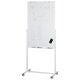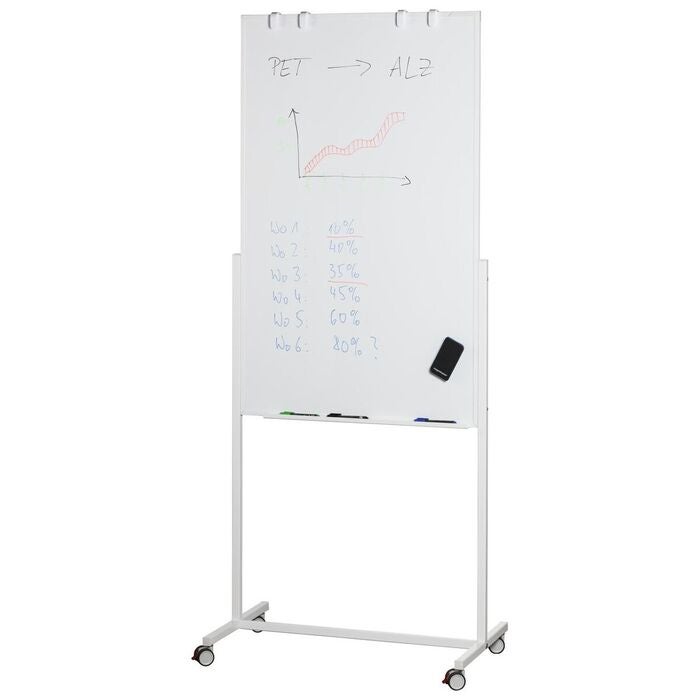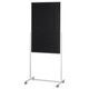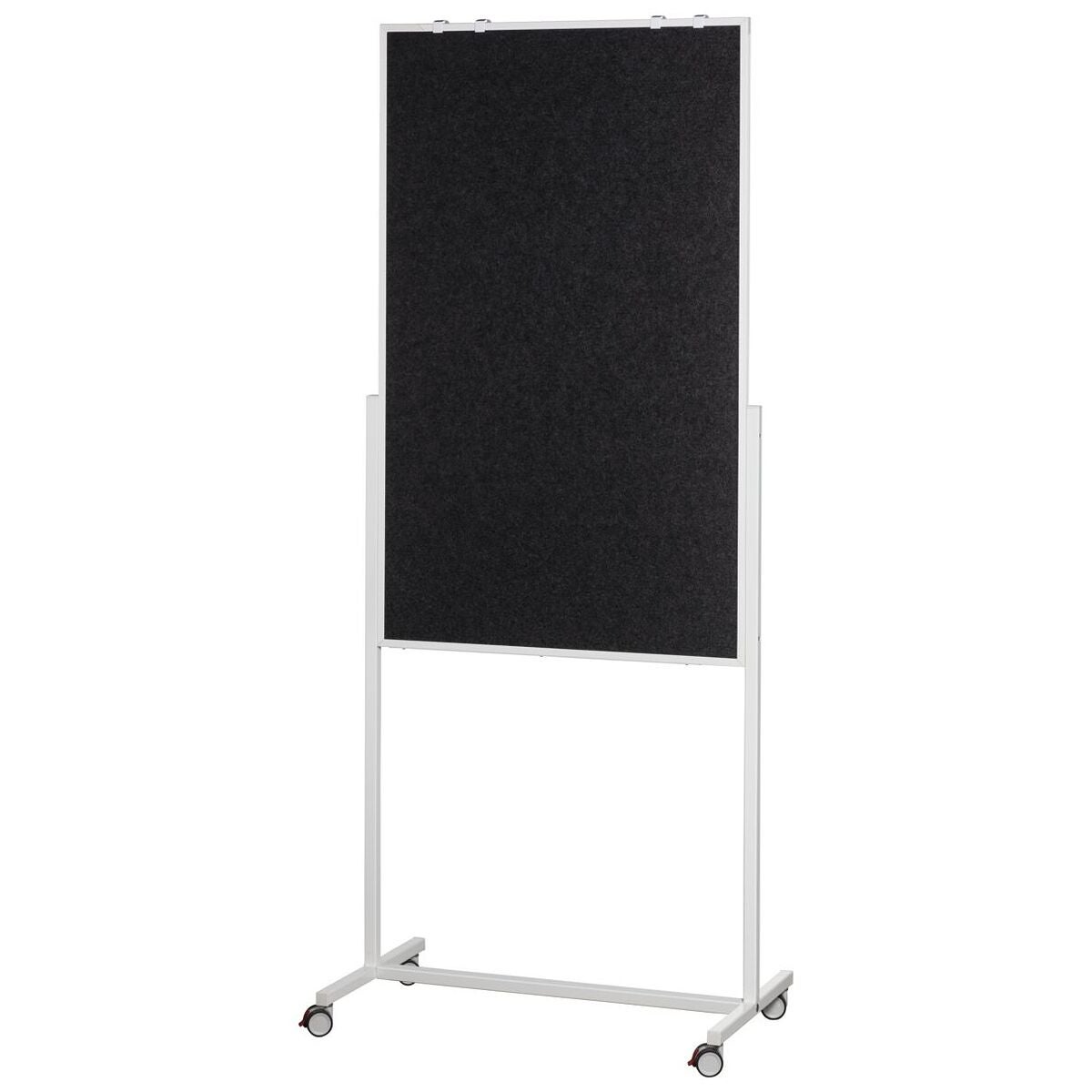 Baksida: Anslagstavla med grå yta av rPET-filt, för fastsättning av presentationsmaterial. Med en aluminiumram i vitt, med pulverbeläggning. Mobil tack vare 4 möbelhjul med lätt gång (låsbara). Blädderblock kan sättas fast på båda sidor.