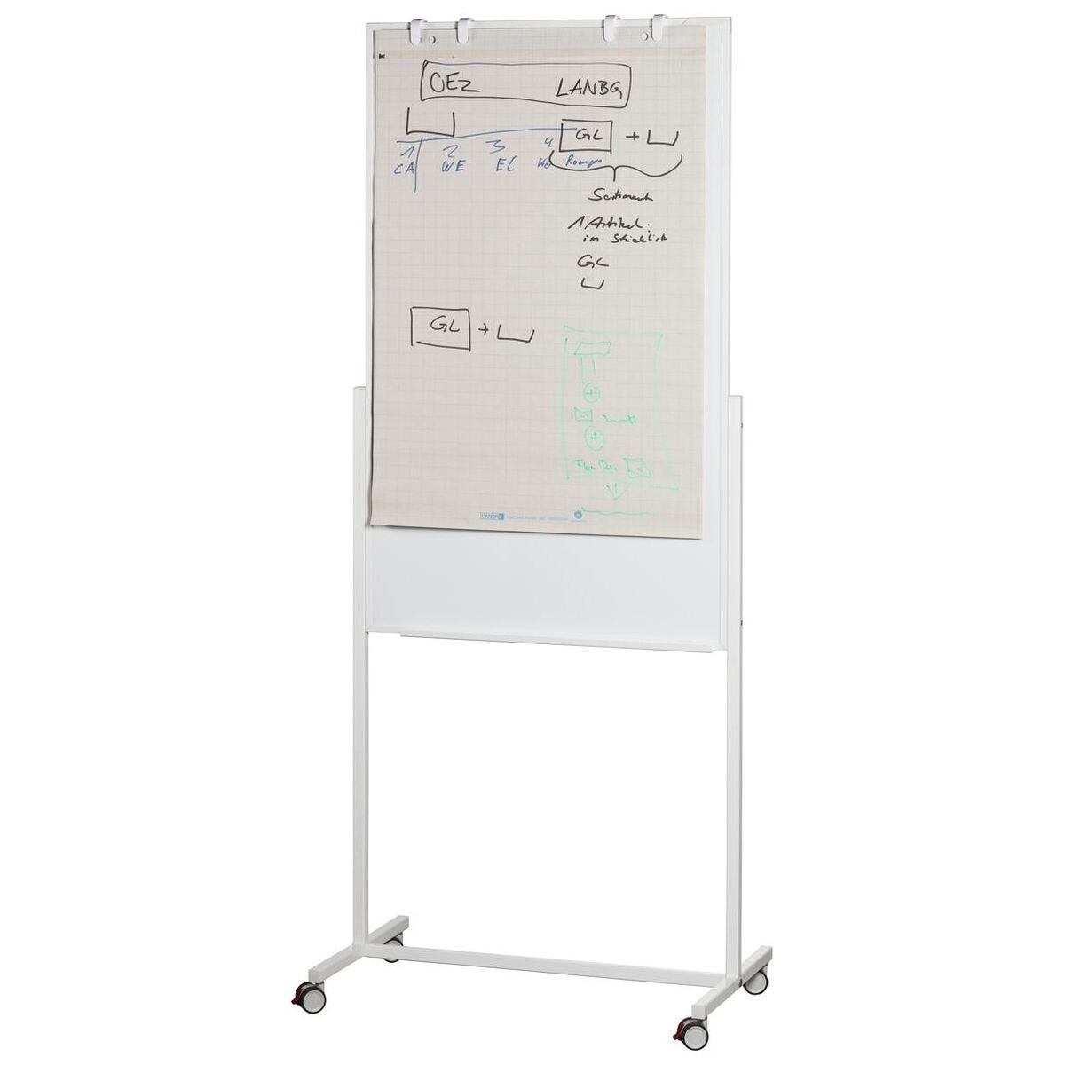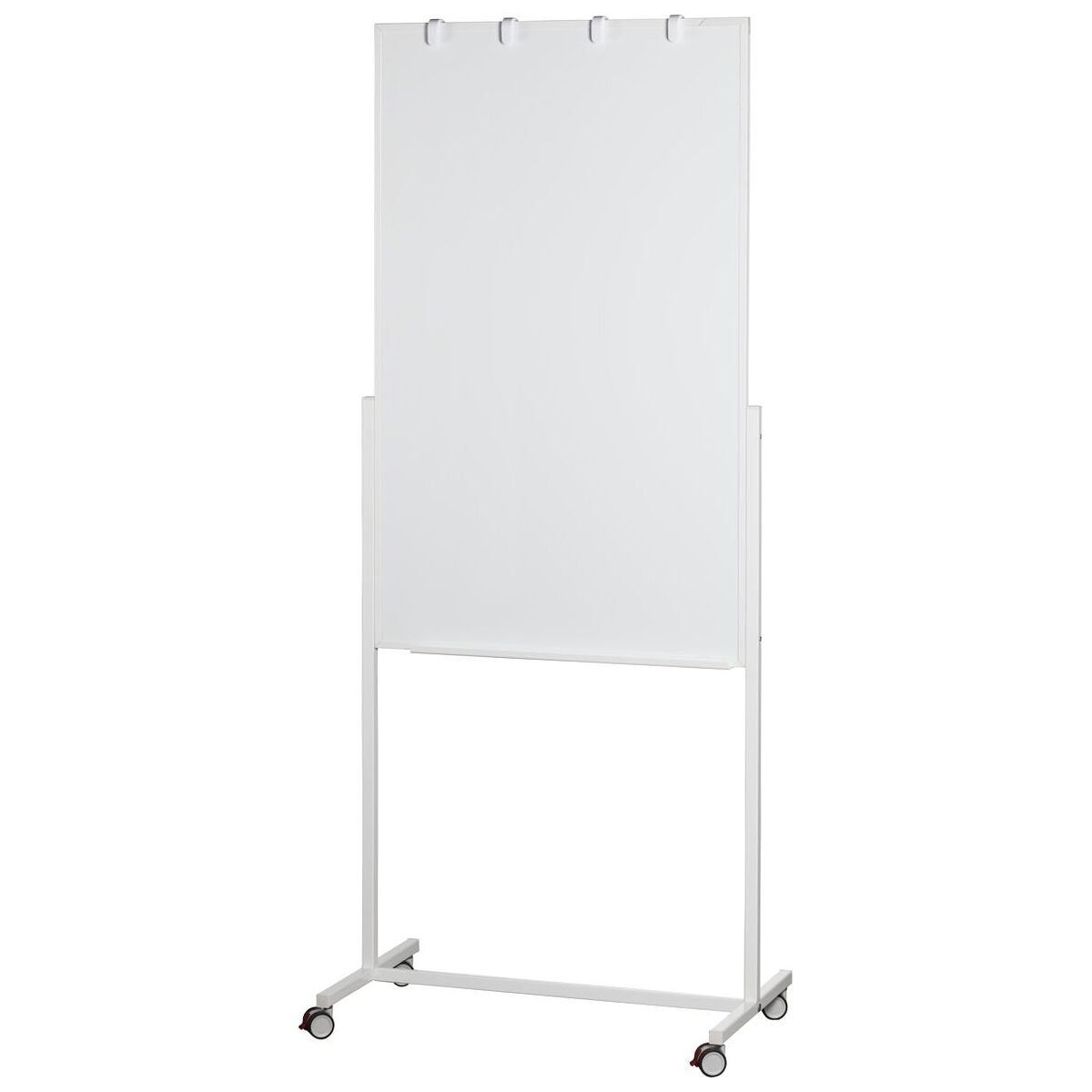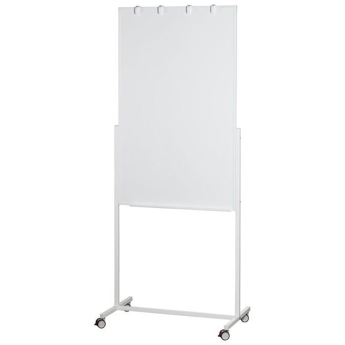 Framsida: Whiteboard och blädderblock. Med vit, specialmålad och magnetisk skrivyta och integrerad avställniingsskål. Med en fästbar pappershållare för blädderblock som kan anpassas till alla pappersstorlekar med hjälp av flyttbara hållare.
