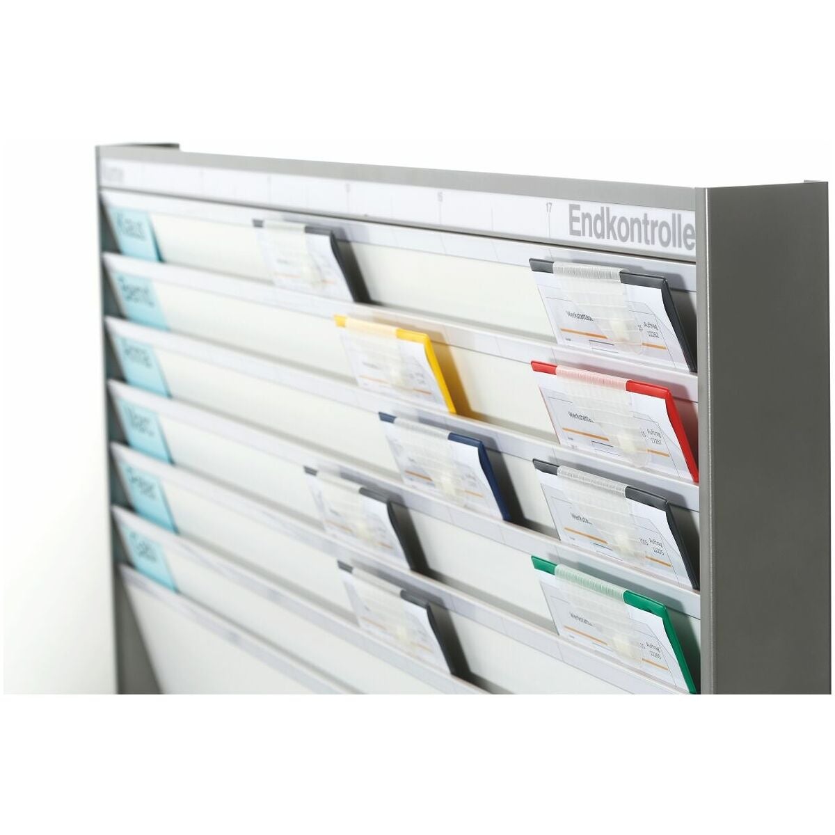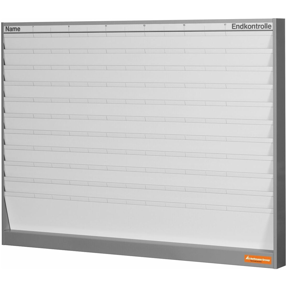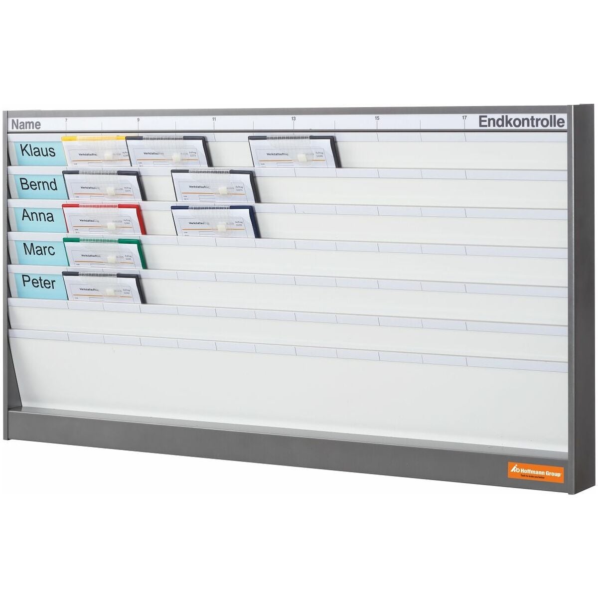 Stabilt plantavelsystem med 55 mm antracitfärgad siktram och öppna spår för fäste av uppdragsväskor nr 974602 i stående A4-format. Sidhuvudet innehåller en indelningsremsa med ordet 'Namn', tidsindelning från 07.00 till 17.00 samt 'Slutkontroll', och ger därmed en överblick över de aktuella förloppen. Sidhuvudet kan på förfrågan även fås på språken engelska, spanska, franska, italienska och nederländska. Namnskyltarna som anbringas på sidan stöder också överskådligheten och möjliggör en optimal tilldelning.