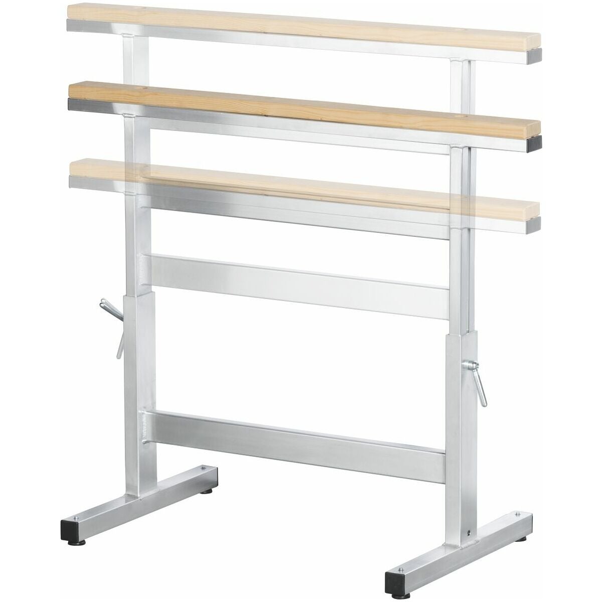 Arbetsbock av aluminium. Steglöst höjdjusterbar från 700 till 1000 mm. Utbytbar slityta av furu. (1000 × 60 × 25 mm). Säker spärr genom koniskt handtag vid varje justeringsrör. Tväravstyvnng på båda delar. Stativfötter med ställskruvar för nivåutjämning. Balkändar med täckkåpor. Levereras komplett monterad.