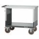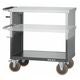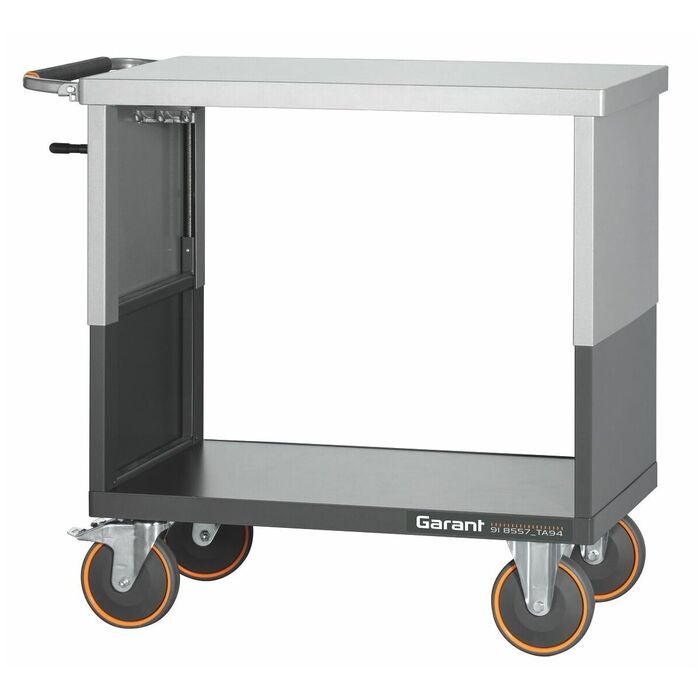 Manuell höjdinställnng med handvev. Lastplanet rör sig då uppåt och nedåt med 4 mekaniska spindellyftben. Handtag med Haptoprene-inlägg av slagtålig polypropen, som kan fällas uppåt när handveven används. 2 fasta och 2 svängbara hjul (med broms) med spårfri polyuretanlöpbeläggnng, rullagrade nav.