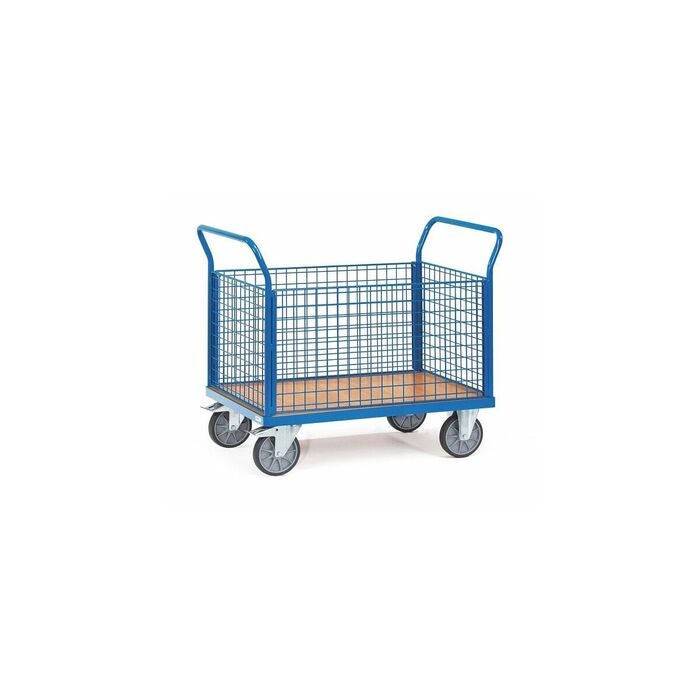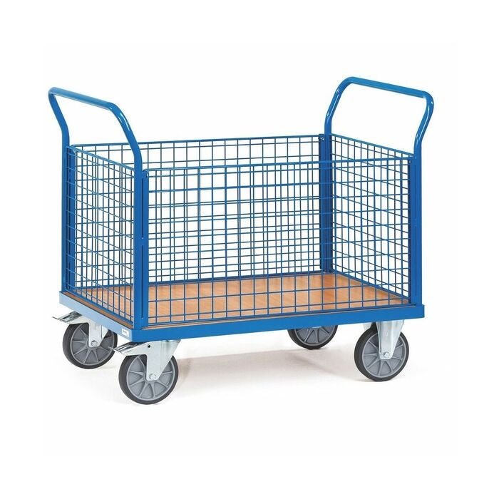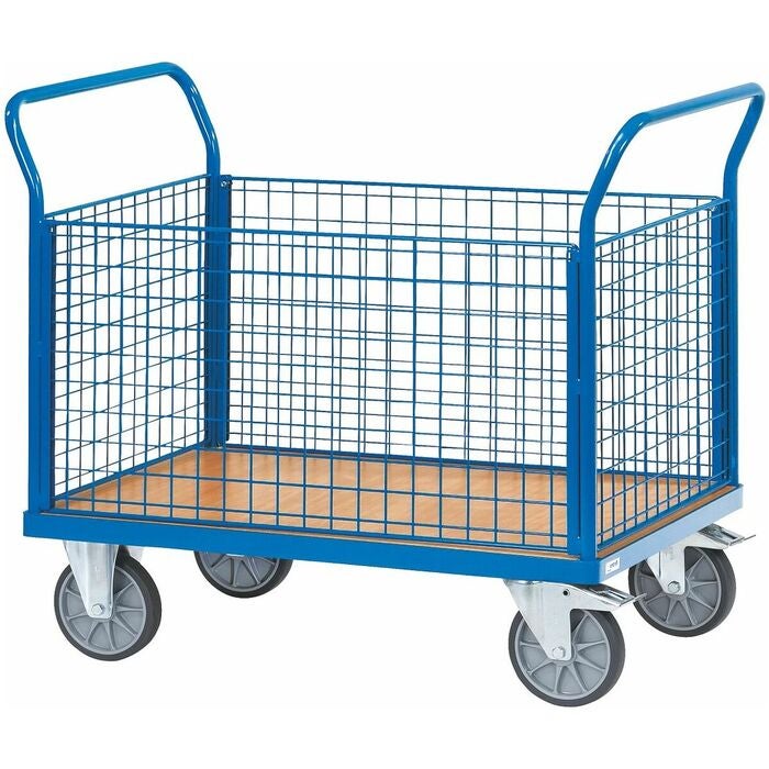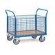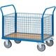 Gallervagn med en avtagbar långsida. Lastplan av träfiberskivor med ytdekor av bok, svetsad stålkonstruktion, 2 fasta och 2 svängbara hjul (med broms), TPE-däck och rullagrade nav.
