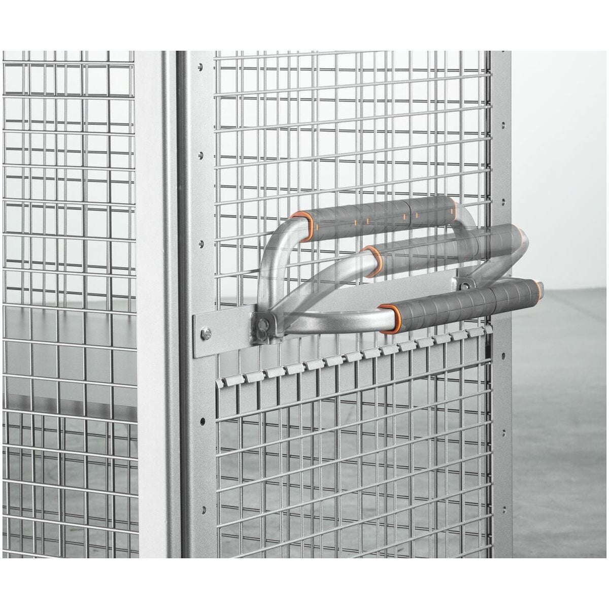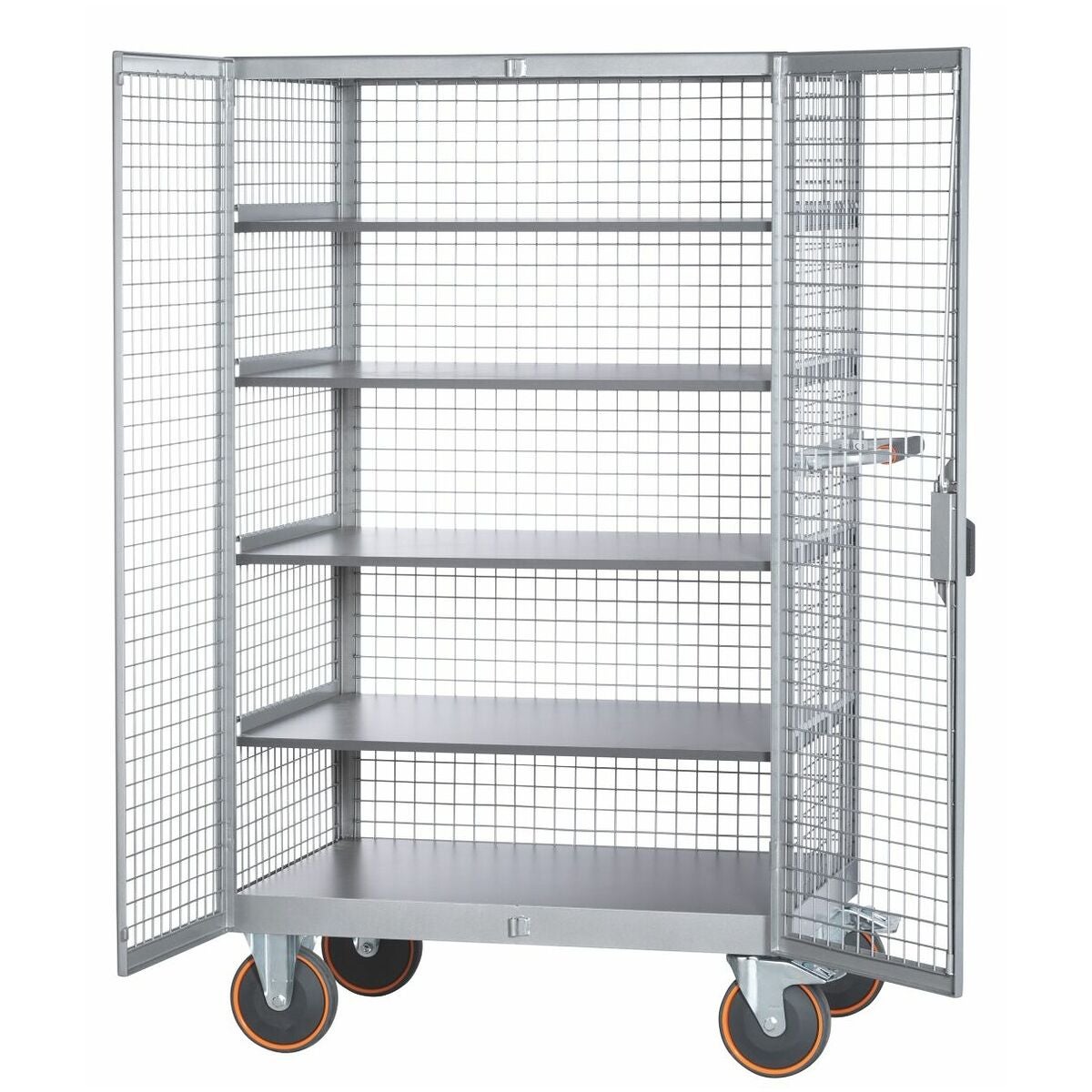 Svetsad stålkonstruktion, hyllor av träfiberskiva med antracitfärgad reptålig yta. Justerbar i 40 mm raster. Det sidmonterade fällbara handtaget med 2K-Haptoprene-överdrag möjliggör en mycket stor dörröppningsvinkel. Med vardera 2 kullagrade bockhjul och svängbara hjul (med parkeringsbroms) med omönstrad polyuretanlöpyta, ⌀ 200 mm. Centralt låsbar med 2K-Haptoprene-skjuthandtag med stiftcylinderlås.