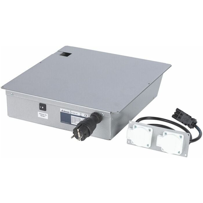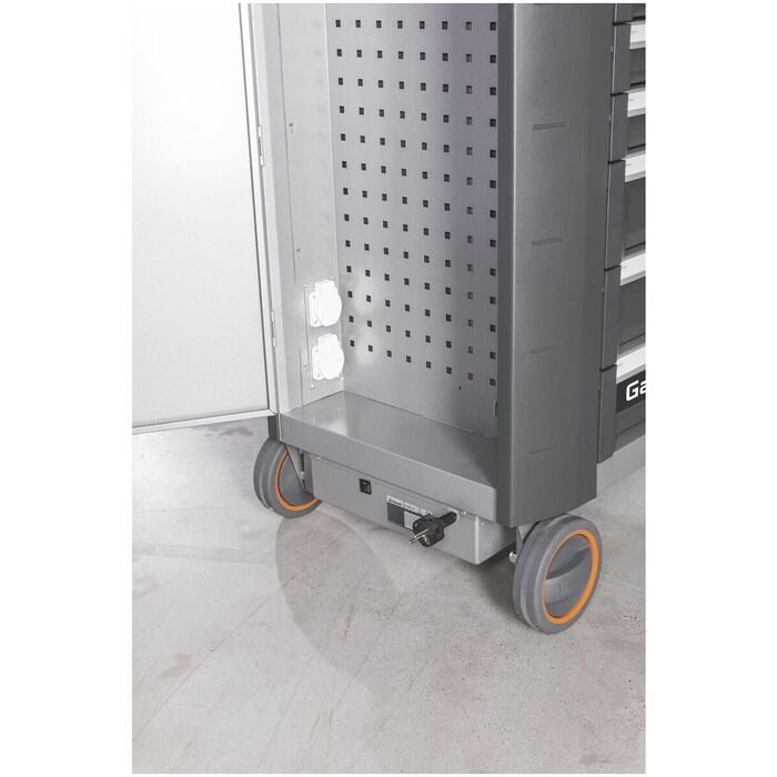 Kabelupprullare med 5,0 m lång neoprenkabel, 2 jordade stickkontakter med täckplåt för montering i verkstadsvagnens sidfack (ansluts till kabelupprullaren med en Wieland-stickkontakt).