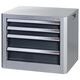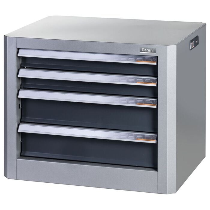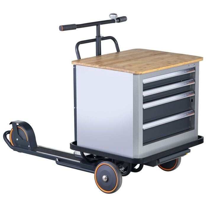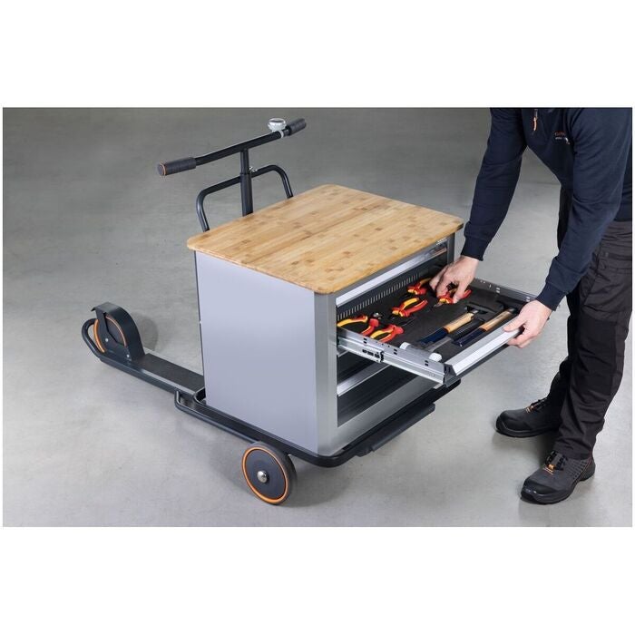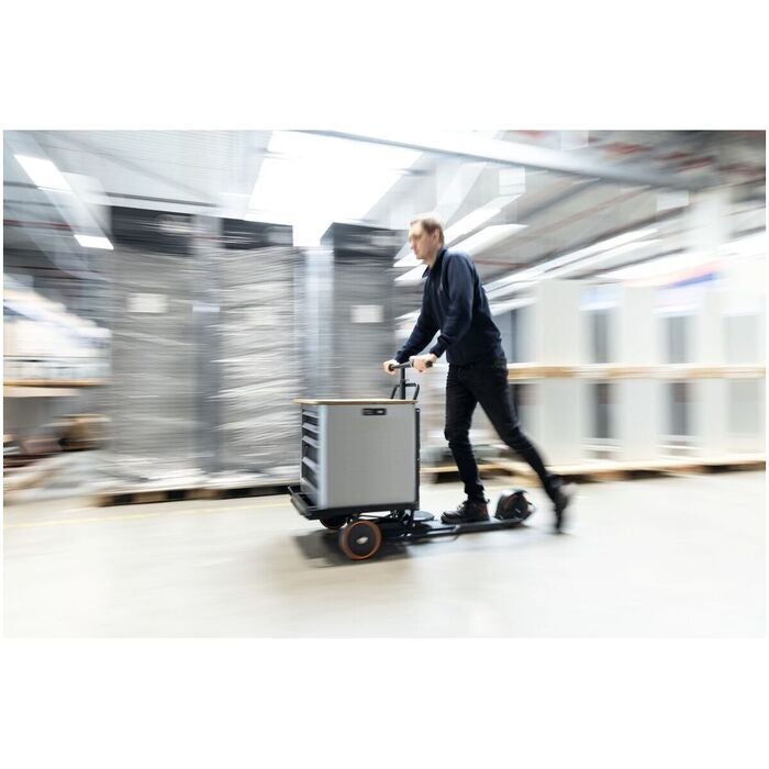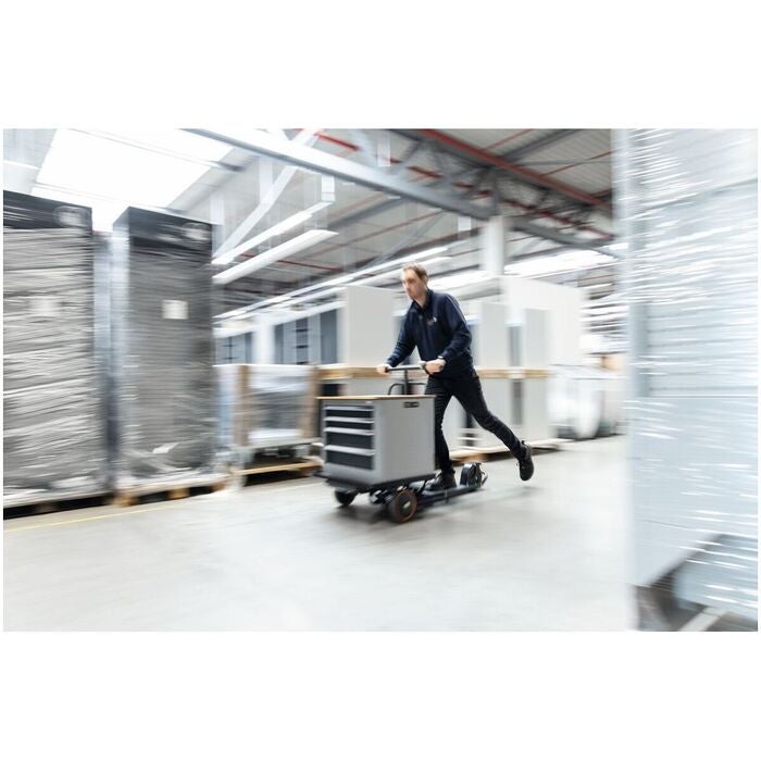 Lådpåbyggnad för Cargo Scooter av robust stålplåtshölje. Till 100 % utdragbara lådor med 20 kg lastkapacitet, grepplister i aluminium med utbytbara och återanvändbara märkremsor. Centralt låsbar med knappnålscylinderlås i låspanelen.
