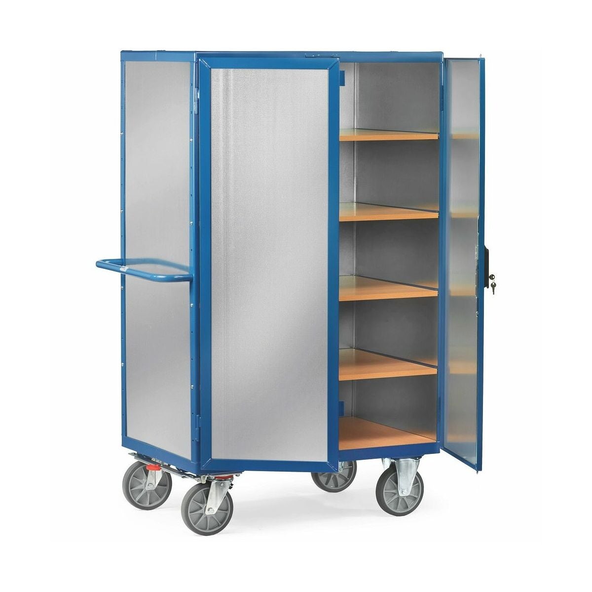 Vinkelstålskonstruktion med rörskjuthandtag. Ändväggar, längsgående vägg, slagdörr och tak inklädda med 1 mm tjock förzinkad stålplåt. Parslagdörr av vinkelstål med drivregellås med vridarm och cylinderlås. 1 fast och 4 lösa hyllor av trämaterialskivor med ytdekor av bok. Inläggshyllorna är justerbara i 100-mm-raster. Den nedersta hyllan inte justerbar. 2 fasta och 2 svängbara hjul (med broms), TPE-däck och rullagrade nav. Centralt TOTALSTOP-bromssystem på svängbara hjul.