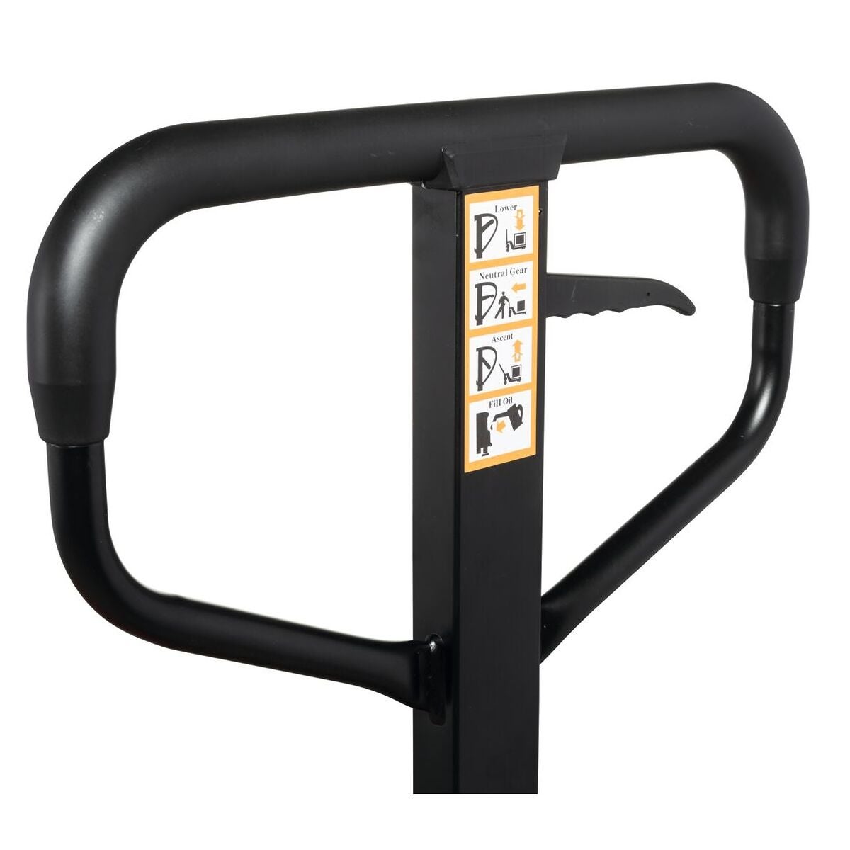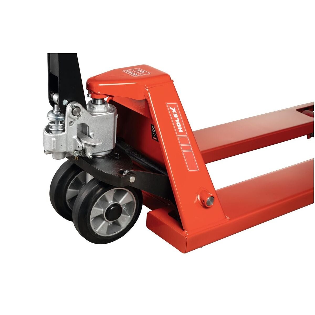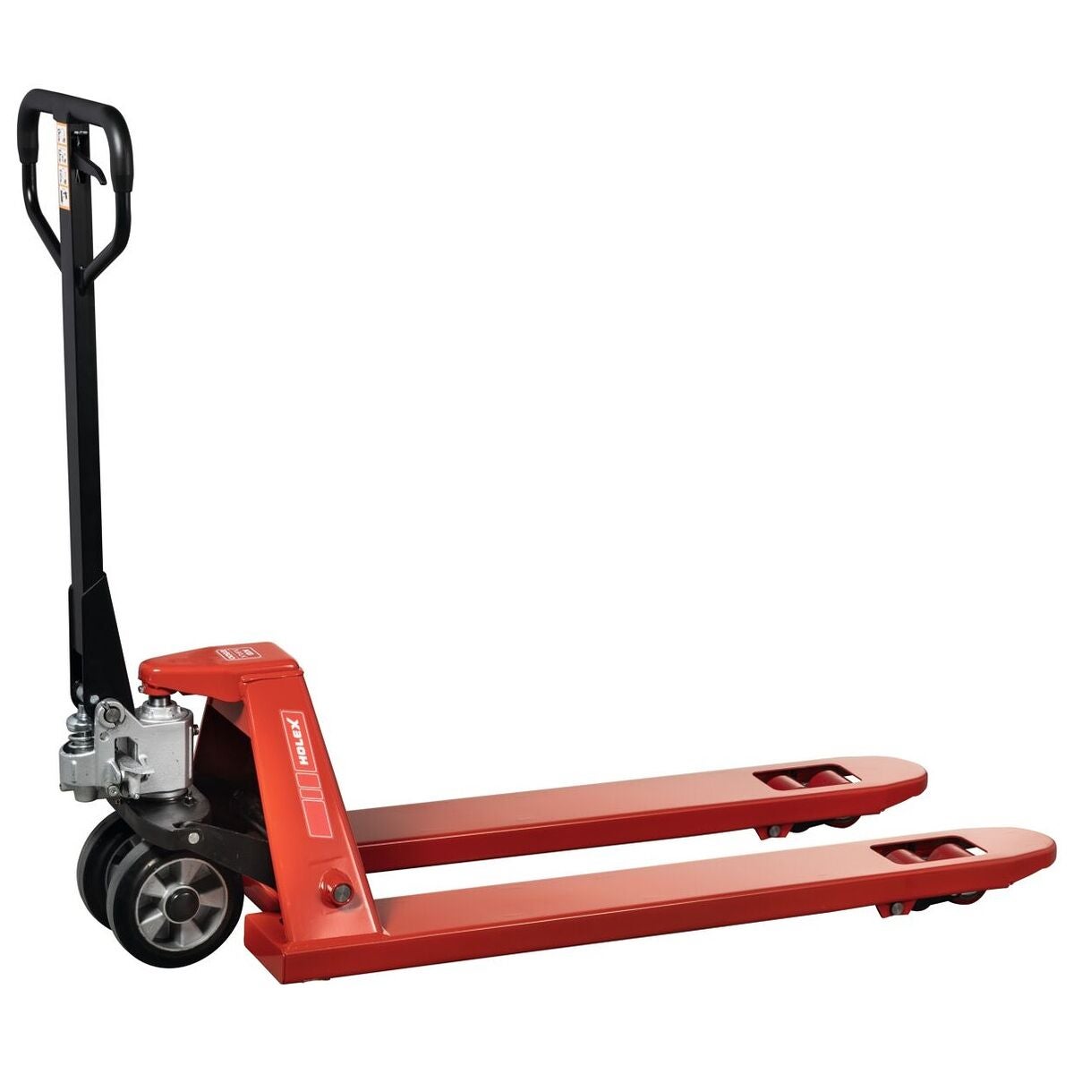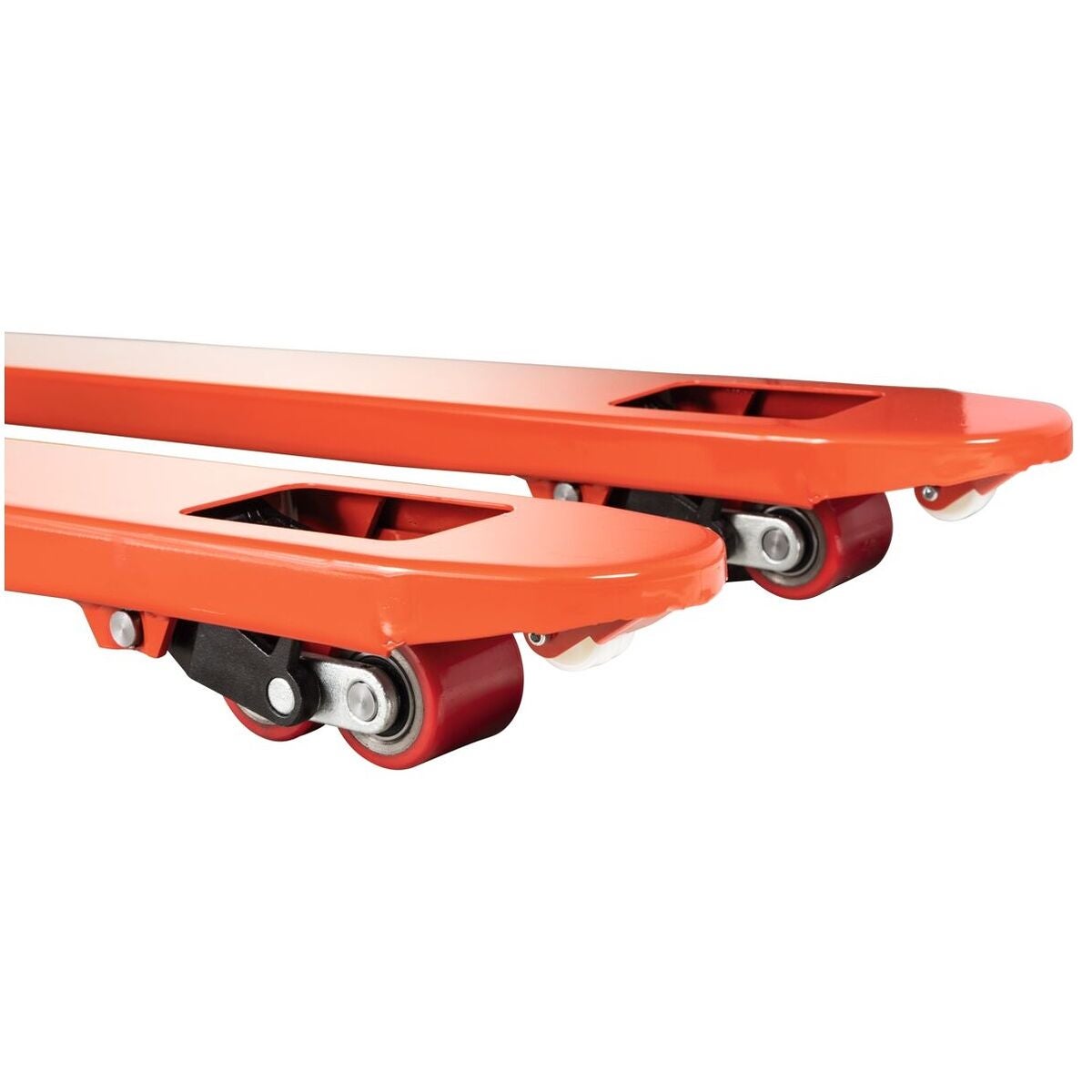 Handdriven gaffeltruck för ergonomisk transport av varor. Ram och gafflar i vridstyv skalkonstruktion. Stabilt körhandtag med motlager för påskjutning. Bekväm åkning, lyft och sänkning med det ergonomiska handtaget. Gaffelrullar Tandem polyuretan röda ⌀ 80 × 70 mm.
