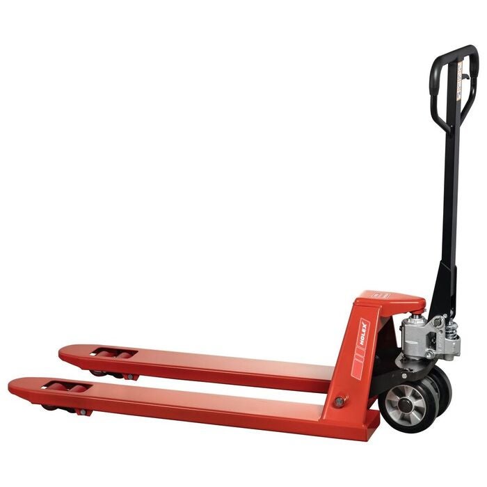 Handdriven gaffeltruck för ergonomisk transport av varor. Ram och gafflar i vridstyv skalkonstruktion. Stabilt körhandtag med motlager för påskjutning. Bekväm åkning, lyft och sänkning med det ergonomiska handtaget. Gaffelrullar Tandem polyuretan röda ⌀ 80 × 70 mm.