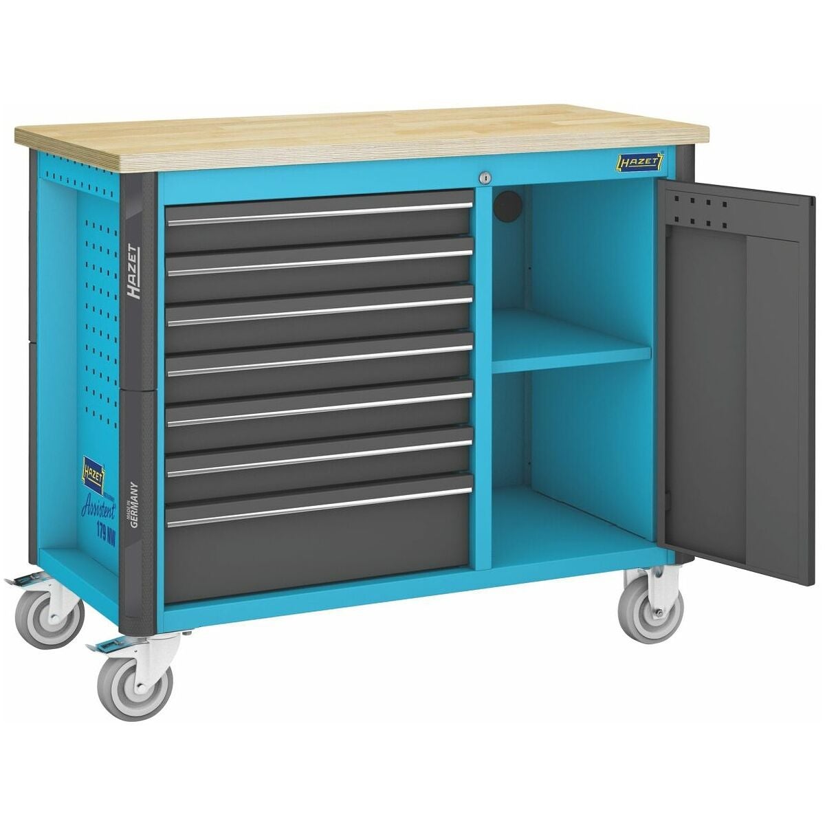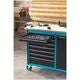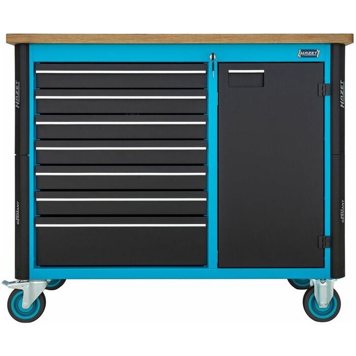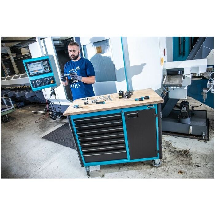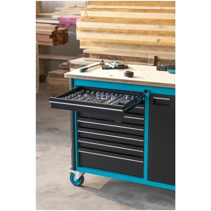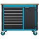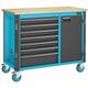 Rullarbetsbänk med 7 utdragslådor och skåpdel med ett justerbart hyllplan. Centrallåsning med cylinderlås och ömsesidig utdragsspärr. Stomme med genomgående kantskyddshörn. Utdragslådornas bärförmåga 25 kg, en låda för tunga laster med 40 kg. Arbetsskiva av björk-multiplex, lämplig för flexibel skruvstyckesmontering, utbytbar. Total bärförmåga 750 kg. 2 svängbara hjul med parkeringsbroms och 2 fasta hjul.