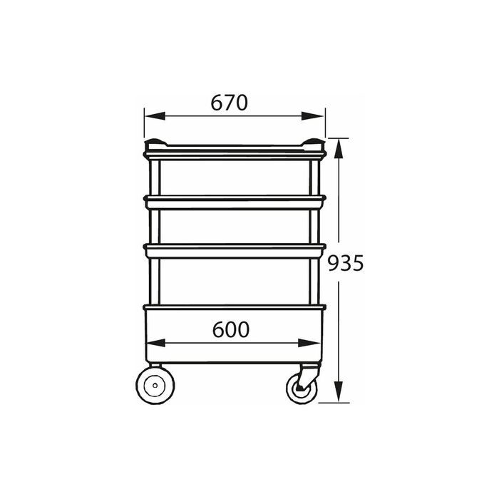 Centrallåsning med cylinderlås. Med rullagrade löphjul (2 svängbara hjul med broms, 2 fasta hjul).