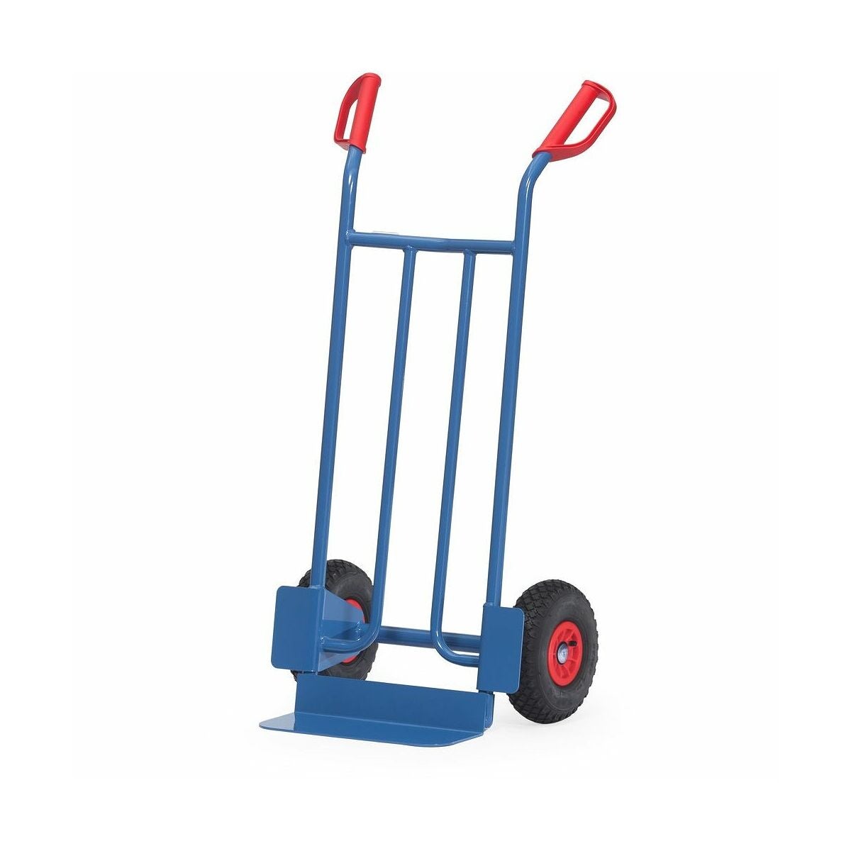 Av stålrör med lastplatta av stålplåt. Luftdäck på plastfälg med rullagrat nav.