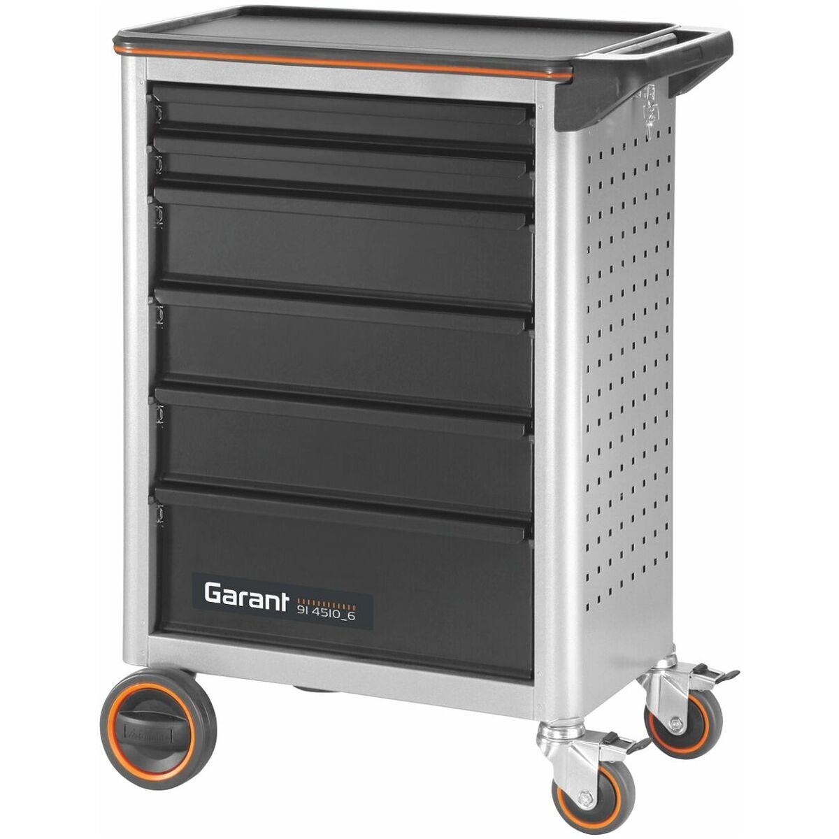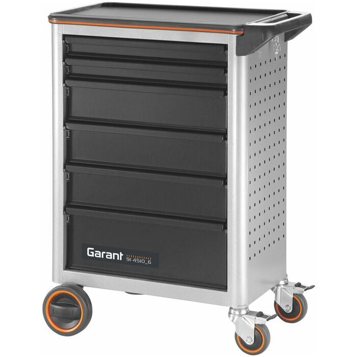 Verkstadsvagnens stabila hus av stålplåt har perforerade sidoväggar för förvaring av tillbehör. Lådans insida har slitsade lister för indelning av lådan. Lådan lösgörs med ett frikopplingshandtag som är inbyggt i grepplisten. Lådorna kan låsas centralt med cylinderlås. Med rullagrade löphjul (2 svängbara hjul med broms, 2 fasta hjul).
