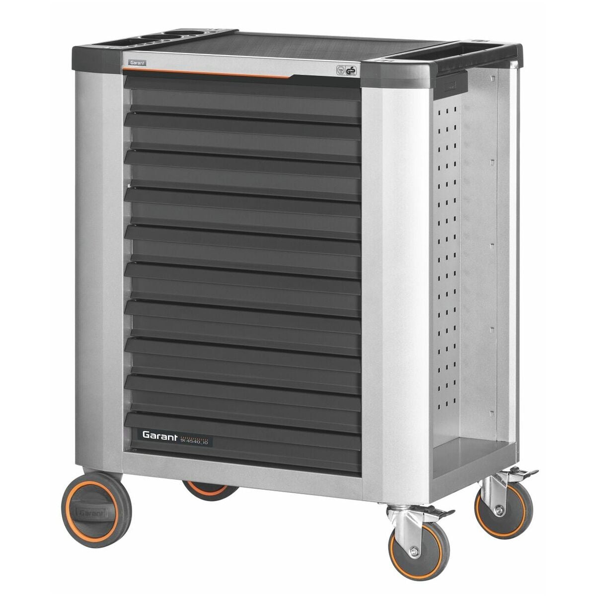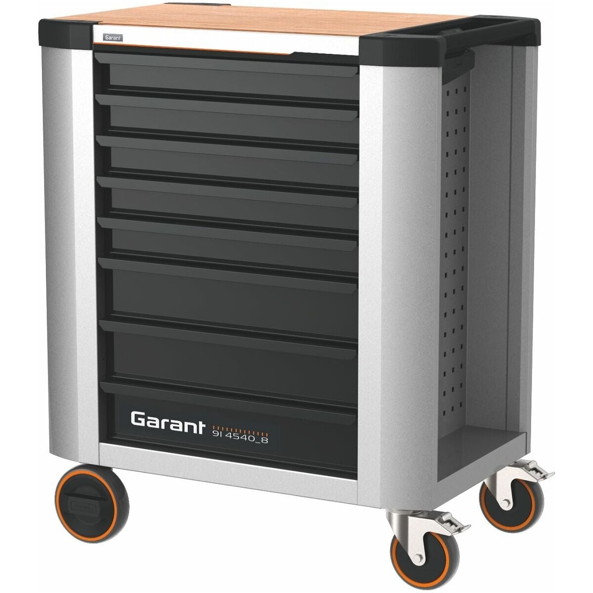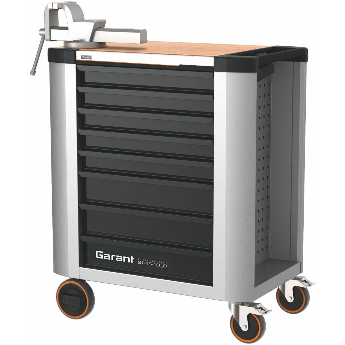 Verkstadsvagn med reptålig och halksäker X-ABS-avläggshylla som är ytterst skonsamt mot ytor. Avläggshyllan byts enkelt mot andra arbetsskivor (t.ex. av bambu) eller mot en bambuarbetsskiva med skruvstycke.