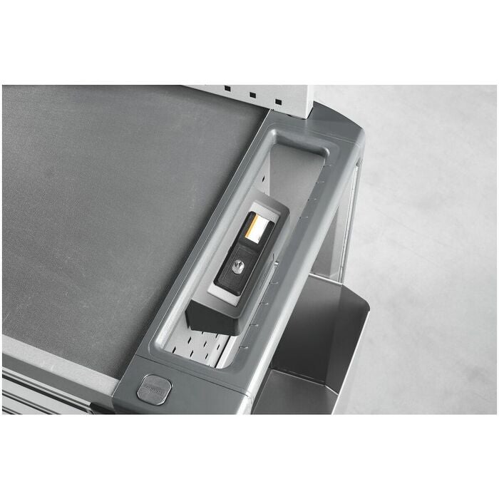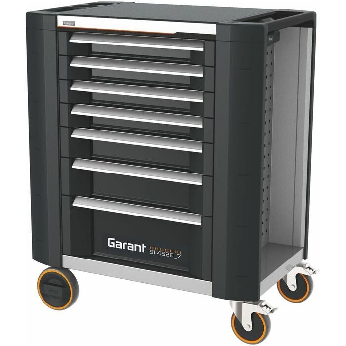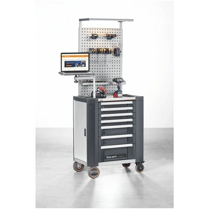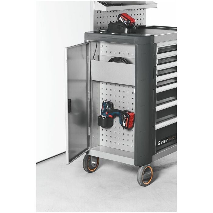 Verkstadsvagnen ToolCar med reptålig, halksäker och synnerligen ytvänlig GARANT GridLine-matta. Avläggshyllan kan enkelt bytas mot andra arbetsskivor (t.ex. av bambu) eller mot en bambuarbetsskiva med skruvstycke. Värdefack / sidofack centrallåsbart tillsammans med utdragslådor. Lådfronter och vagnbalkar är försedda med stötfångare av polyeten med låg densitet. Vid en kollision minimerar de skadorna på ömtåliga ytor och arbetsstycken.