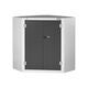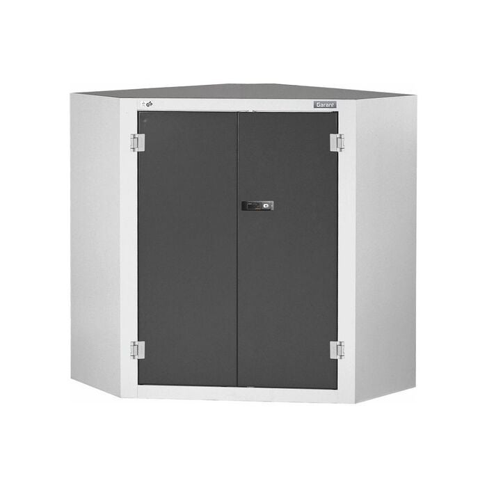 Hörnskåp med två slagdörrar, låsbara med hjälp av skjuthandtag med stiftcylinderlås. Med en fast mellanbotten.