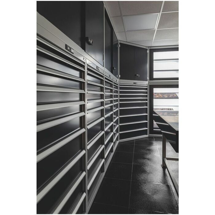 Stålplåt med stagningar, helsvetsade. De vertikala stängerna är försedda med hål c/c 25 : 25 mm för infästning av lådor, utdragshyllor eller fackhyllor. Bottenfläns med gängade hylsor för höjdutjämning och golvförankring.