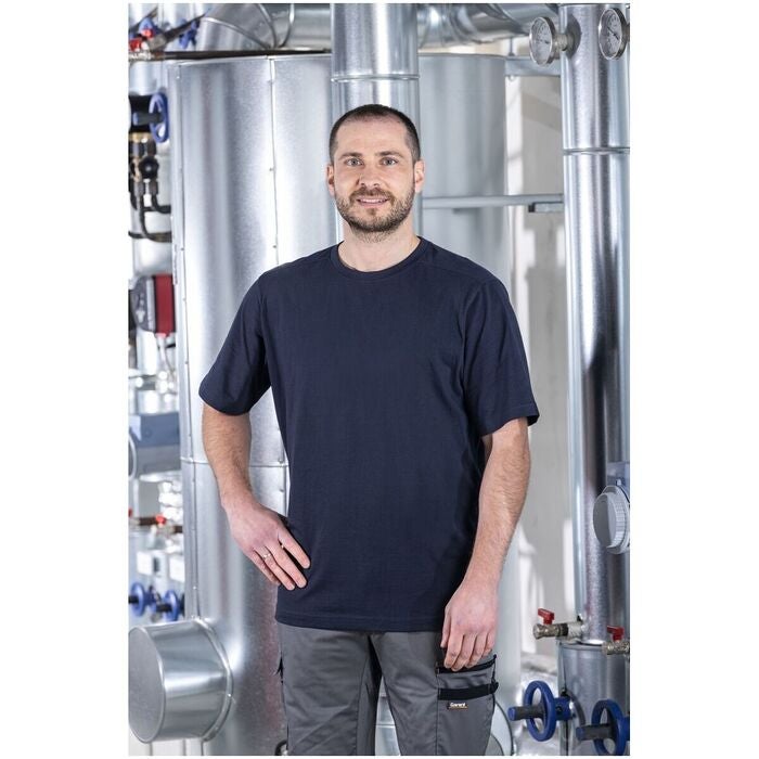 Kvalitativ T-shirt av 100 % bomull. Den mjuka, kammade bomullen ger en bekväm bärkänsla, även under långa arbetsdagar. Det klassiska snittet sörjer för en stor rörelsefrihet, medan de hållbara sömmarna gör att T-shirten håller sin form.