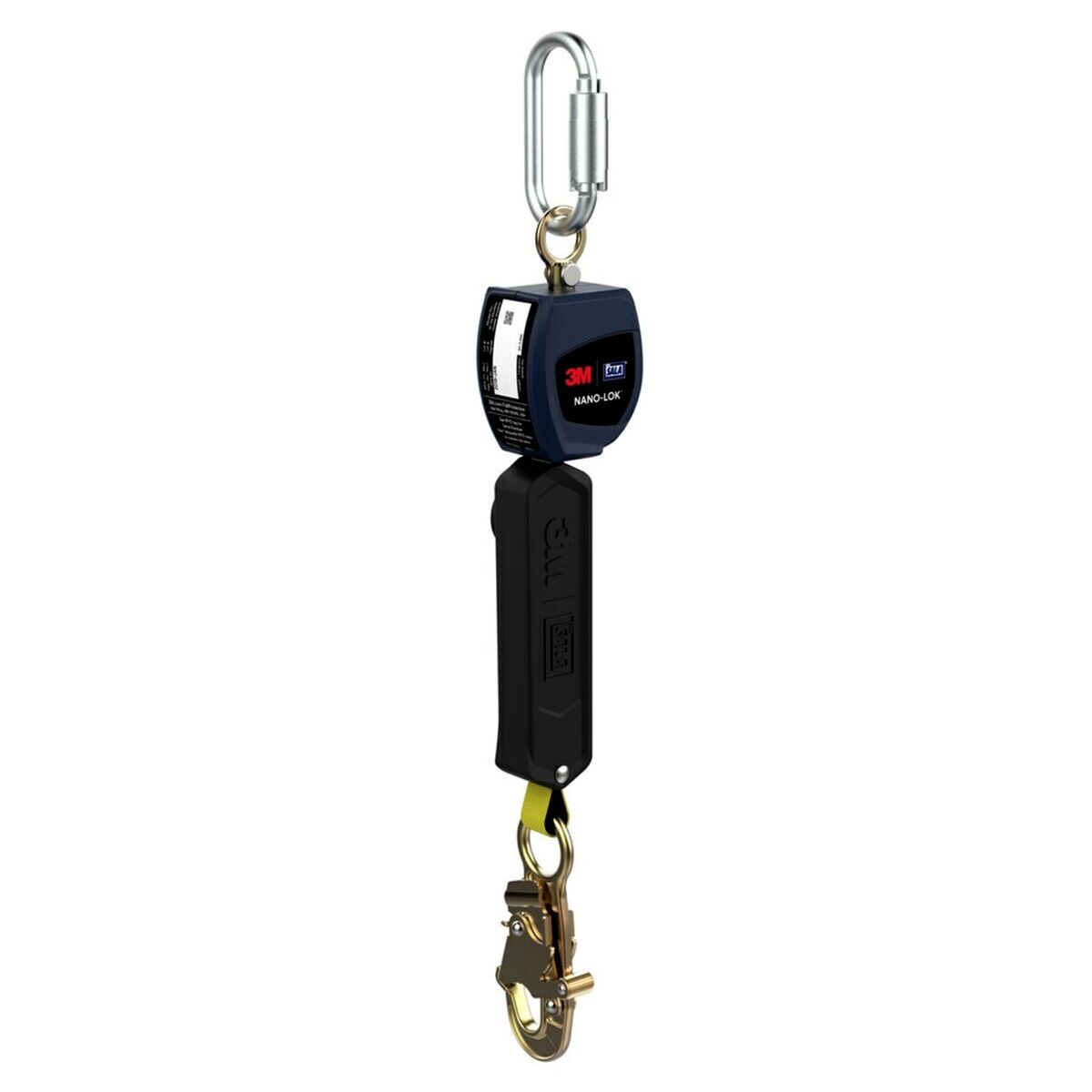 3M™ DBI-SALA® fallskyddsblock Nano-Lok™ 3101461. På huset: Tri-Lock-karbinhake av stål med öppningsvidd 19 mm. På bandet: Ställningskrok av aluminium med öppningsvidd 57 mm. Den mycket korta bromssträckan gör att den är lämplig för arbeten på låg höjd. En lekare hindrar selen från att sno sig. Största användarvikt 140 kg. Produktens livslängd 10 år. Utrustad med en RFID-transponder.
