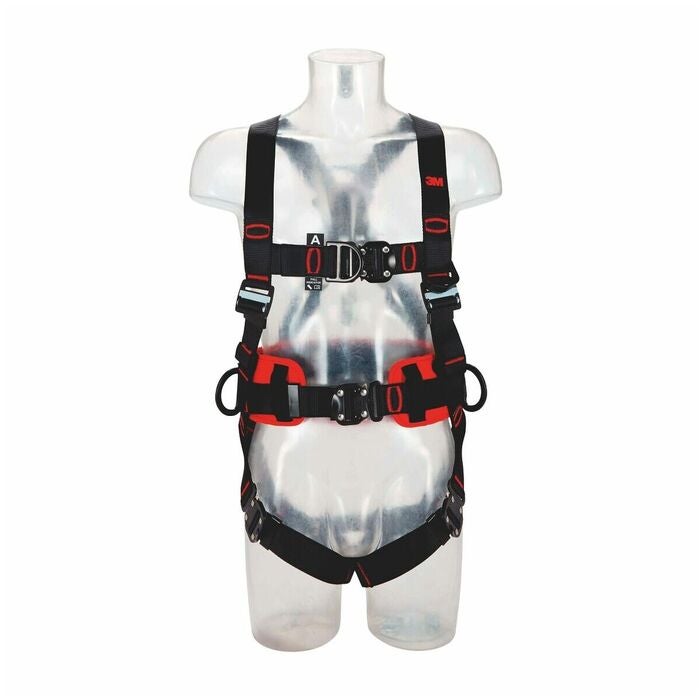 3M™ PROTECTA® fallskyddssele 1161634 med komfortstödbälte och fästöglor på sidorna, bröstet och ryggen. Automatiska lås för snabb på- och avtagning. Vattenavvisande och slitstarkt selband. Bandändsförvaring för överskjutande selband. Med arbetspositioneringsbälte för arbete med båda händerna fria. Största användarvikt 140 kg. Produktens livslängd 10 år.