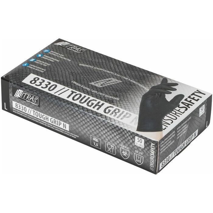 8330 Touch Grip N. Nitril-engångshandskar, sats, i dispenser med innovativ fjällig yta för bättre oljegrepp. Stark och tålig.