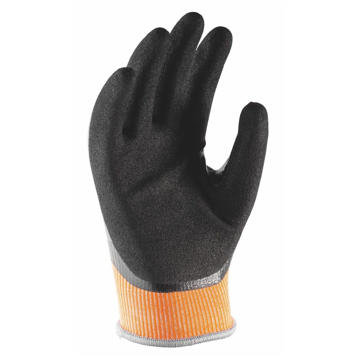 Tätt anliggande och extremt bekväm genom 18 gauge-stickningstekniken. Behaglig nitrilmikroskumplastbeläggning som ger en synnerligen god bärkänsla och hög fingerrörlighet. Det gör dem mycket lämpliga för exakt hantering av små skarpkantade delar. Genom beläggning helt i nitril upp över fingerlederna mycket lämpliga för oljiga miljöer. Ett andra beläggningsskikt av sandad nitril på handflatan och fingrarna ger ett mycket säkert grepp. Med förstärkt tumveck för längre livslängd.