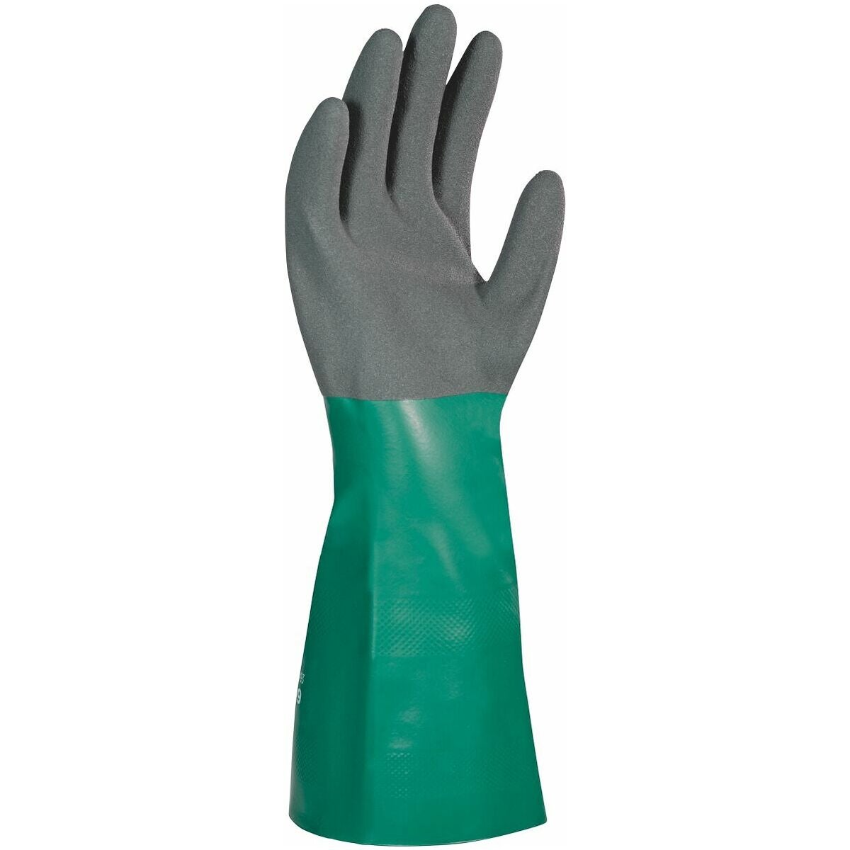 AlphaTec® 58-435. Skyddshandske av bärarlöst nitrilmaterial med innerfoder av bomullsvelour. Hög flexibilitet och mycket bra fingerrörlighet. Den åtsittande passformen gör att handsken sitter på ordentligt på handflatan. Den effektiva nitrilbeläggningen ger ett enastående skydd mot skärsår, stickskador och skrapsår. En stängbar barriär på skaftet förhindrar att det kommer droppar på underarmarna, det förlängda skaftet utökar skyddet upp till underarmen.