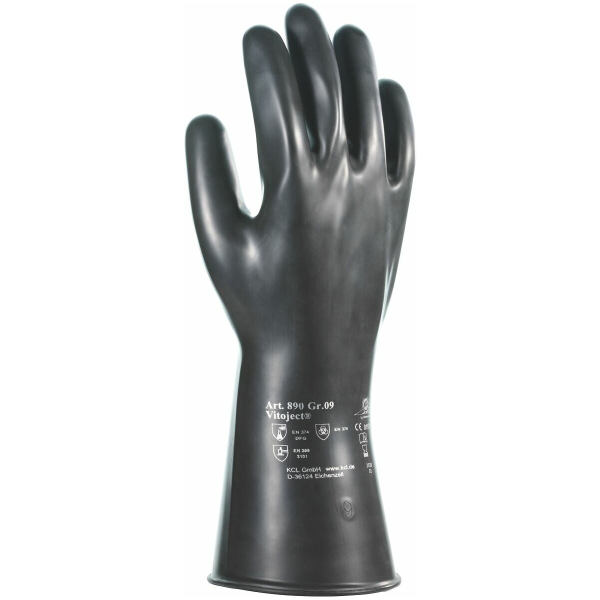 Vitoject® 890. Skyddshandske i viton, mycket kemikaliebeständig. Mycket bra skydd mot extremt aggressiva och giftiga kemikalier; t.ex. god beständighet mot polycykliska aromatiska kolväten. Lösningsmedelsfri. Kan kombineras med kemikalieskyddsoveraller.