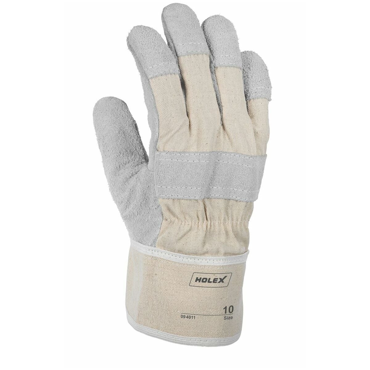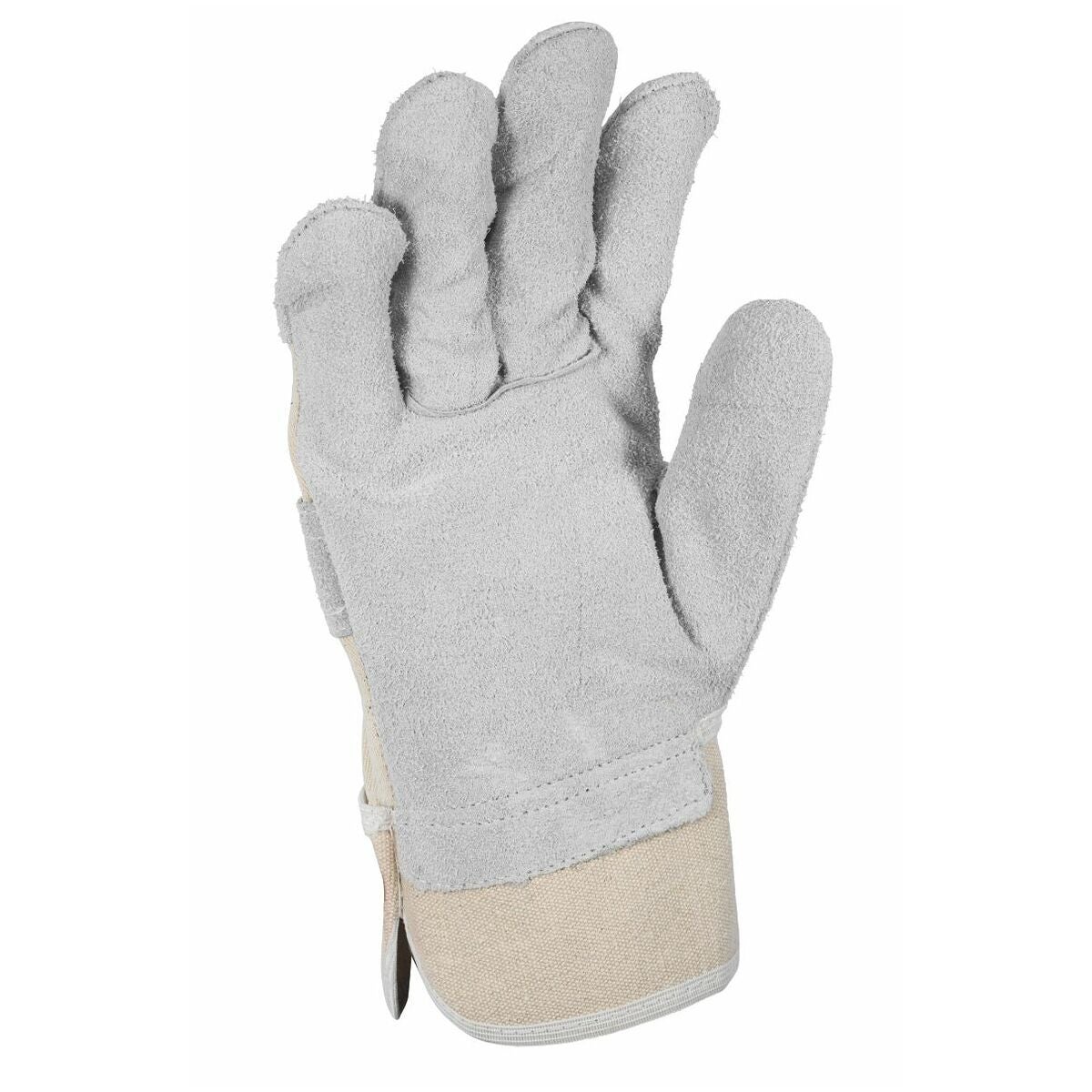 Arbetshandske i nötkreaturläder, med kraftig ryggsida av bomullscanvas. Bekvämt innerfoder på handflatan.