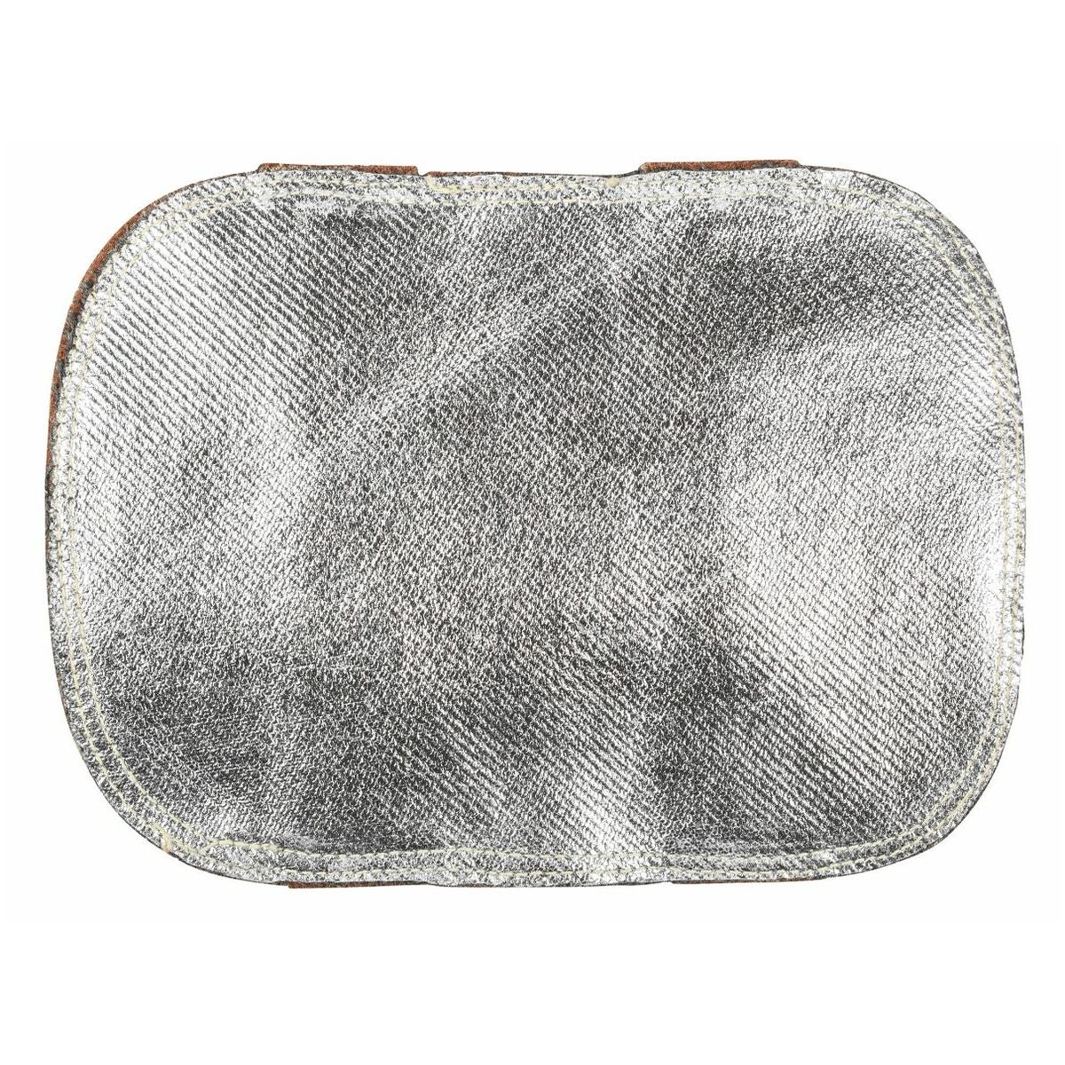Handskydd av oxspaltläder med framsida av aluminiserat tyg för extra skydd mot strålningsvärme. Med kardborrbandlås för fixering. Storlek: 20 x 15 cm.