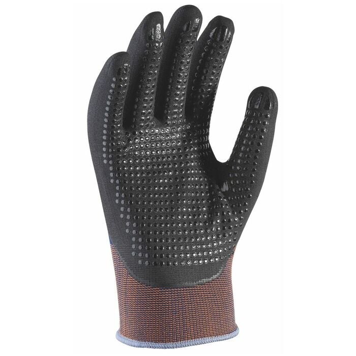 MASTER FIT montagehandske. Med innovativ vattenbaserad polyuretan-nitrilbeläggning för mycket höga krav precision, flexibilitet och taktil känsla i torra arbetsomgivningar. Finstrukturerad yta på handens insida genom den noggranna förädlingsprocessen. Pekskärmsklar, därmed kan du använda smartphones och andra pekskärmar utan att ta av handskarna. Lång livstid genom en mycket hög nötningshållfasthet. DMF-fri och Öko-Tex-certifierad. Med nubbar på handflatan.