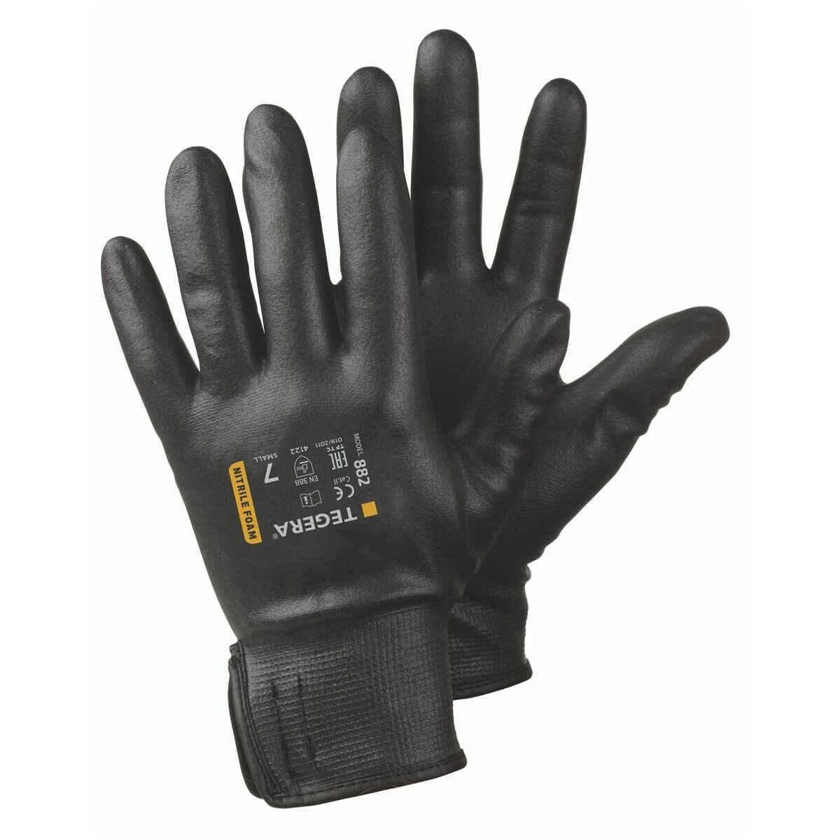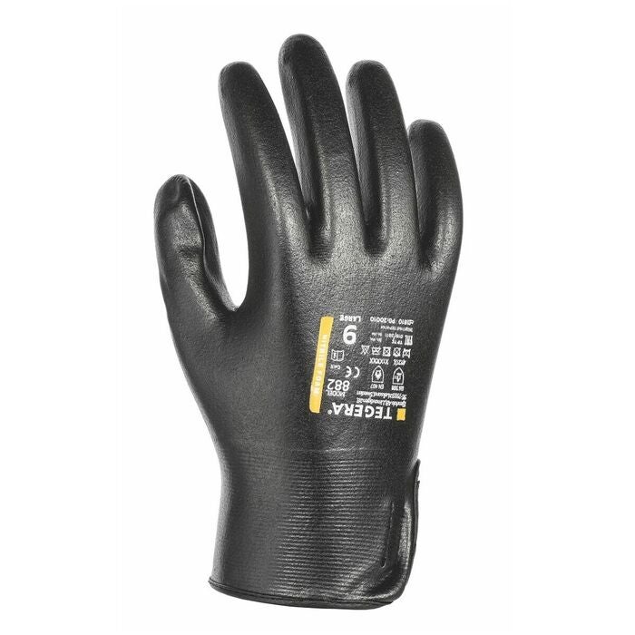 Tegera® 882. Syntethandske med komplett nitrilskumplastbeläggning och bra grepp. Den snäva passformen och goda fingertoppskänslan gör att handsken lämpar sig utmärkt för finmekaniska tilämpningar i fuktig eller oljig omgivning. Kontaktvärme upp till 100 °C.