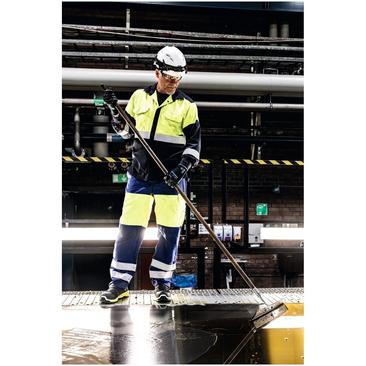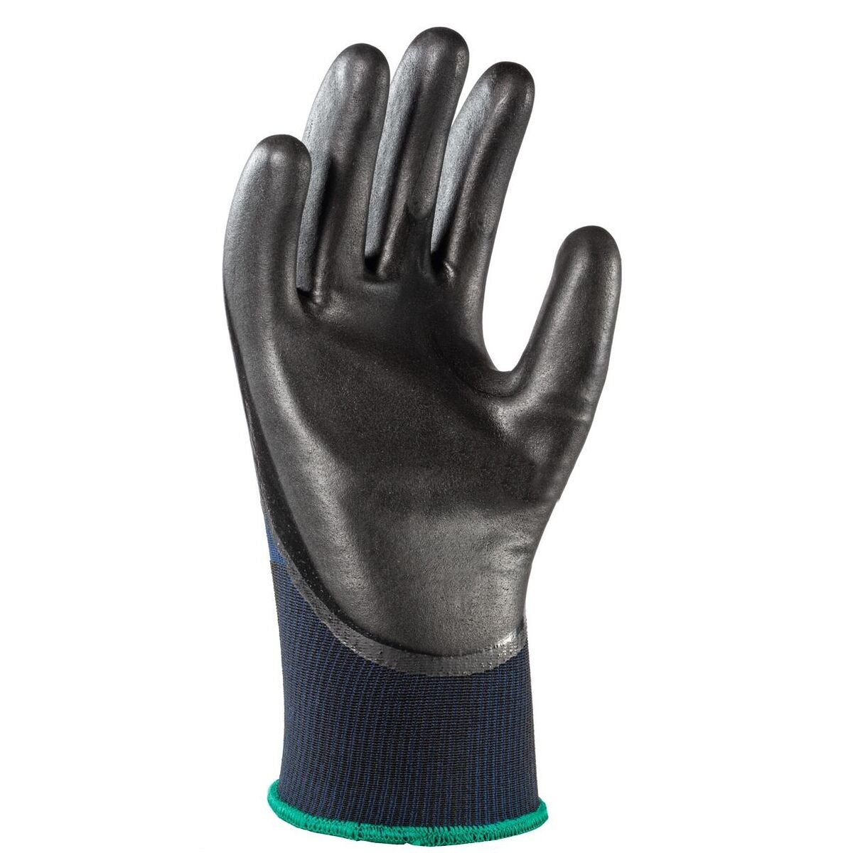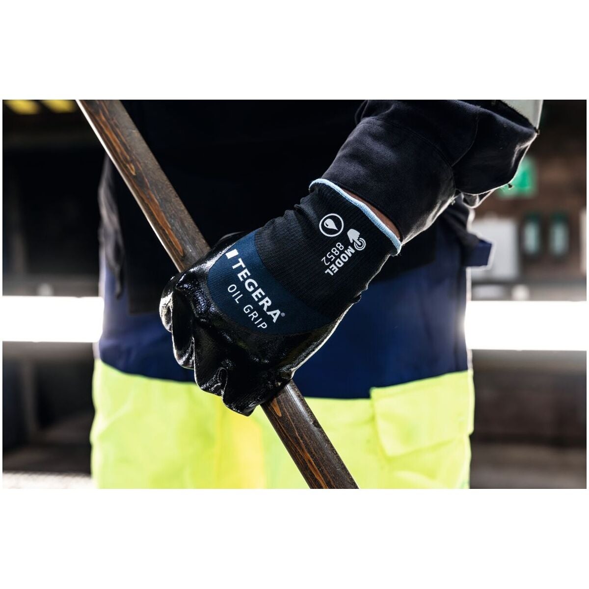 Tegera® OIL GRIP 8852. Den tredubbla nitrilskumbeläggningen i handflatan ger en robust oljebarriär och ett utmärkt grepp. 18G-stickningen är tillverkad av över 90 % återvunnen polyester och ger en bra fingertoppskänsla. Dessutom är handsken pekskärmskompatibel, OEKO-TEX-certifierad och tål kontaktvärme upp till 100 °C.