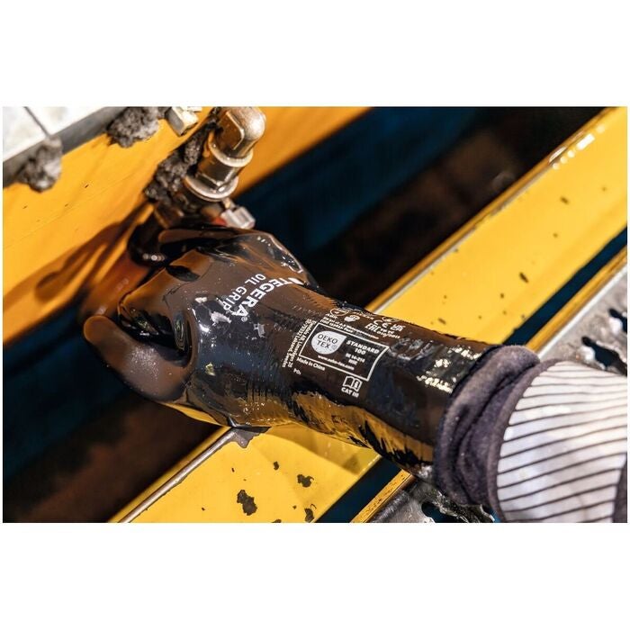 Tegera® OIL GRIP 8853. Den vattentäta handsken med förlängd manschett och komplett beläggning imponerar med utmärkt grepp. 18G-stickningen är tillverkad av över 90 % återvunnen polyester och ger en bra fingertoppskänsla. Beständighet mot olja och fett. Utmärkt med kemikalieskydd typ C. Dessutom är handsken kompatibel med pekskärm, OEKO-TEX-certifierad och resistent mot kontaktvärme upp till 100 °C kemikalieskydd.