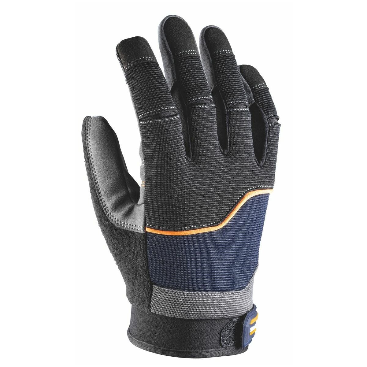 Robust, men mycket flexibel mekanikerhandske för tunga arbeten och hantering av tunga, svårhanterliga föremål. Handflatan består av mycket slitstarkt konstläder. Dessutom absorberar ett vadderat område stötar och slag för ytterligare skydd av händerna. Handryggen är elastisk och andningsaktiv för högsta komfort. Handskarnas pekfingrar kan användas på pekskärmar. Därför kan du bland annat använda din smartphone utan att ta av handsken.