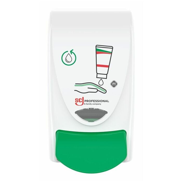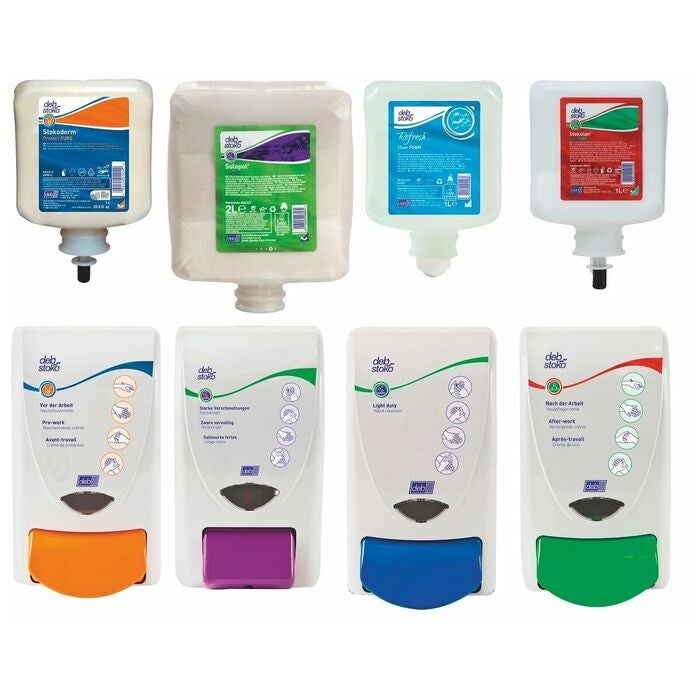 Komplett set för hudskydd, hudrengöring och hudvård. För före, under och efter arbetet. Inklusive automat för väggmontering.