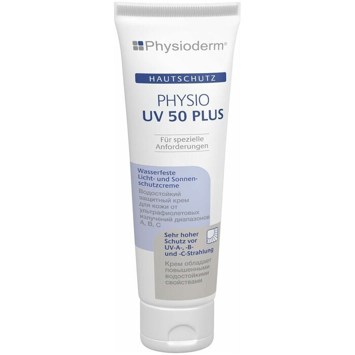 PHYSIO UV 50 PLUS. Extra vattenfast solskyddskräm för de som arbetar utomhus i väta och värme eller vid svetsningsarbeten. Med vitamin E och utan parfym.