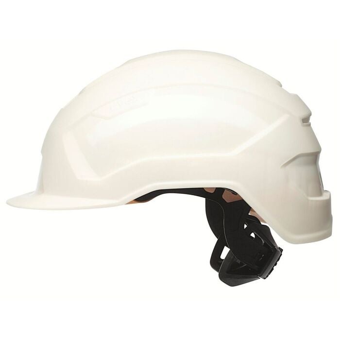 Lätt skyddshjälm av HDPE (High Density Polyethylen) med stängt hjälmskal (utan ventilation) för användning inom elbranschen, upp till AC 1 000 V och DC 1 500 V. Den optimala huvudbandsgeometrin och det stora nackstödet säkerställer en extremt bekväm passform. Adaptersystemet möjliggör kombination med visir, hjälpkapslar och hjälmlampor.